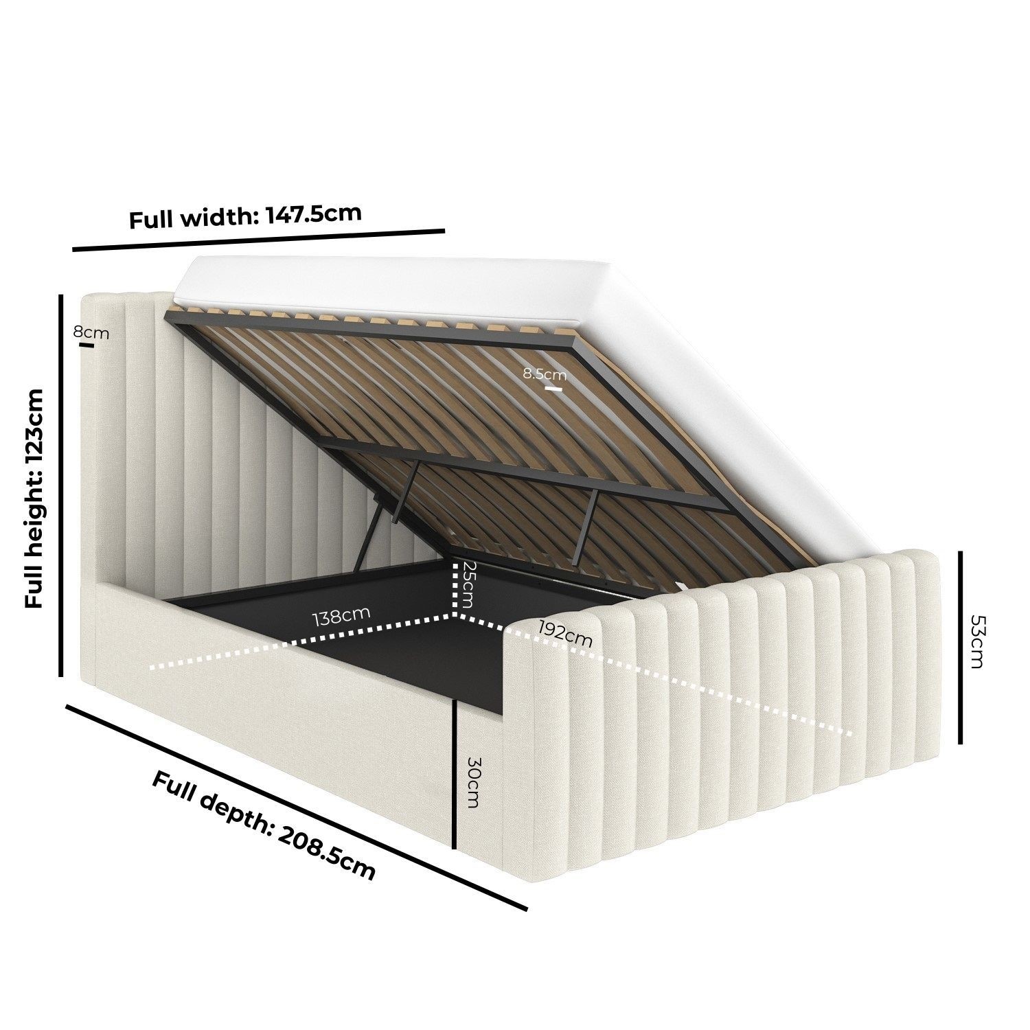 The Khloe Ottoman Bed is an opulent focal point for any bedroom, perfect for adding a touch of luxury while offering practical hidden storage. Upholstered in a soft, durable cream woven fabric, it fits seamlessly into any modern bedroom design. The side-opening gas-lift mechanism allows you to access the generous fabric-lined storage space effortlessly. You can also set the storage frame to open on either the right or left-hand side, allowing extra freedom with your bedroom layout. It features a sprung slatted base for comfortable mattress support, ensuring a great night's sleep. This bed fits a UK standard double-size mattress, which is not included, giving you the freedom to pair it with a mattress of your choice.