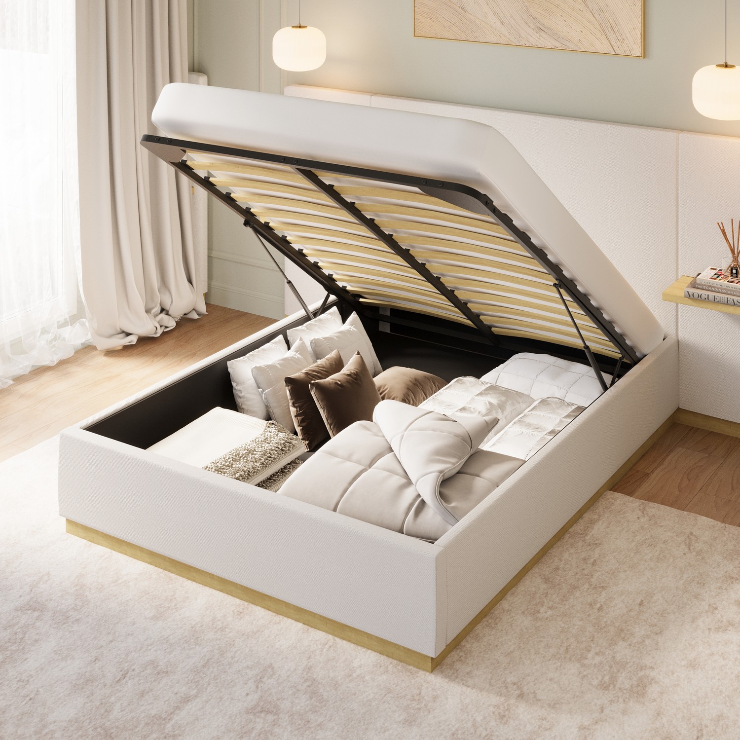 Generous Ottoman Storage: The end-lifting ottoman base, equipped with a smooth gas-lift mechanism, reveals a spacious 745L storage compartment. Ideal for neatly stowing bedding, seasonal linens, or extra cushions.