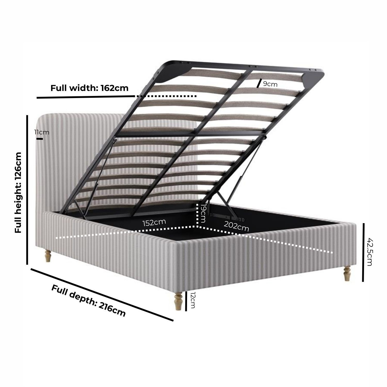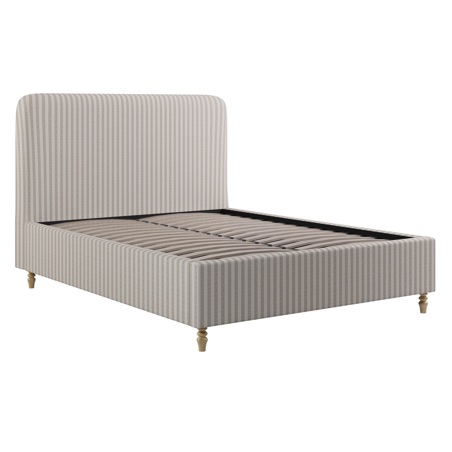 The Farrow Ottoman Bed combines timeless design with everyday practicality. Upholstered in soft, durable ticking stripe chenille, its cream and beige tones create a light, airy aesthetic that feels both classic and on-trend, complementing modern and traditional interiors alike. A softly curved headboard enhances the design, adding style and comfort, while the elegant turned beech wood legs in a natural finish bring warmth and durability. The easy end-lift gas mechanism provides effortless access to a spacious, solid wood storage base, perfect for neatly storing bedding, clothes, or seasonal items. It has a sprung slatted base for flexible mattress support and improved airflow for a cooler, more comfortable night’s sleep. This bed fits a UK standard king-size mattress, which is not included, giving you the freedom to pair it with a mattress of your choice.