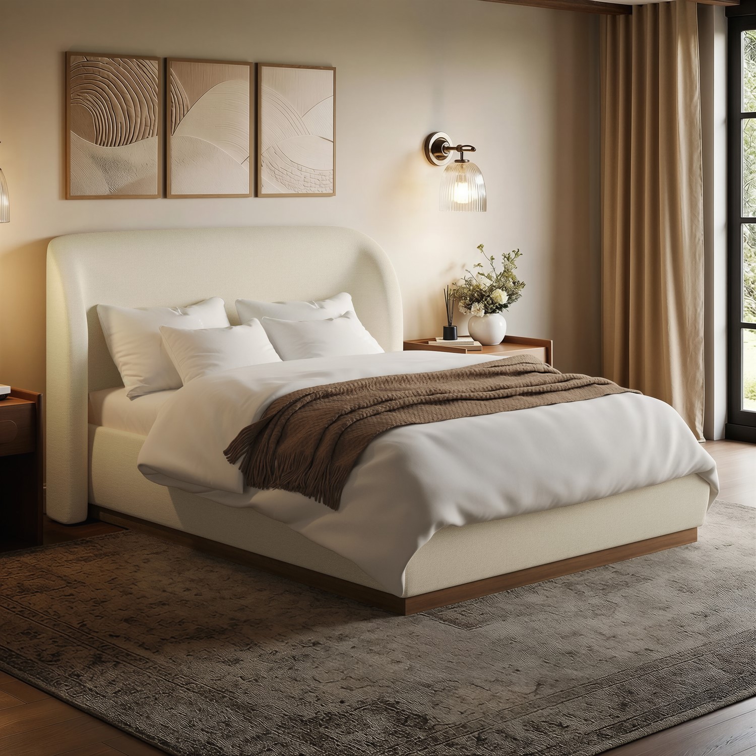 Plush Curved Headboard: The curved winged headboard is generously padded and upholstered in textured fabric, creating a soft, supportive focal point that adds contemporary elegance to your bedroom.