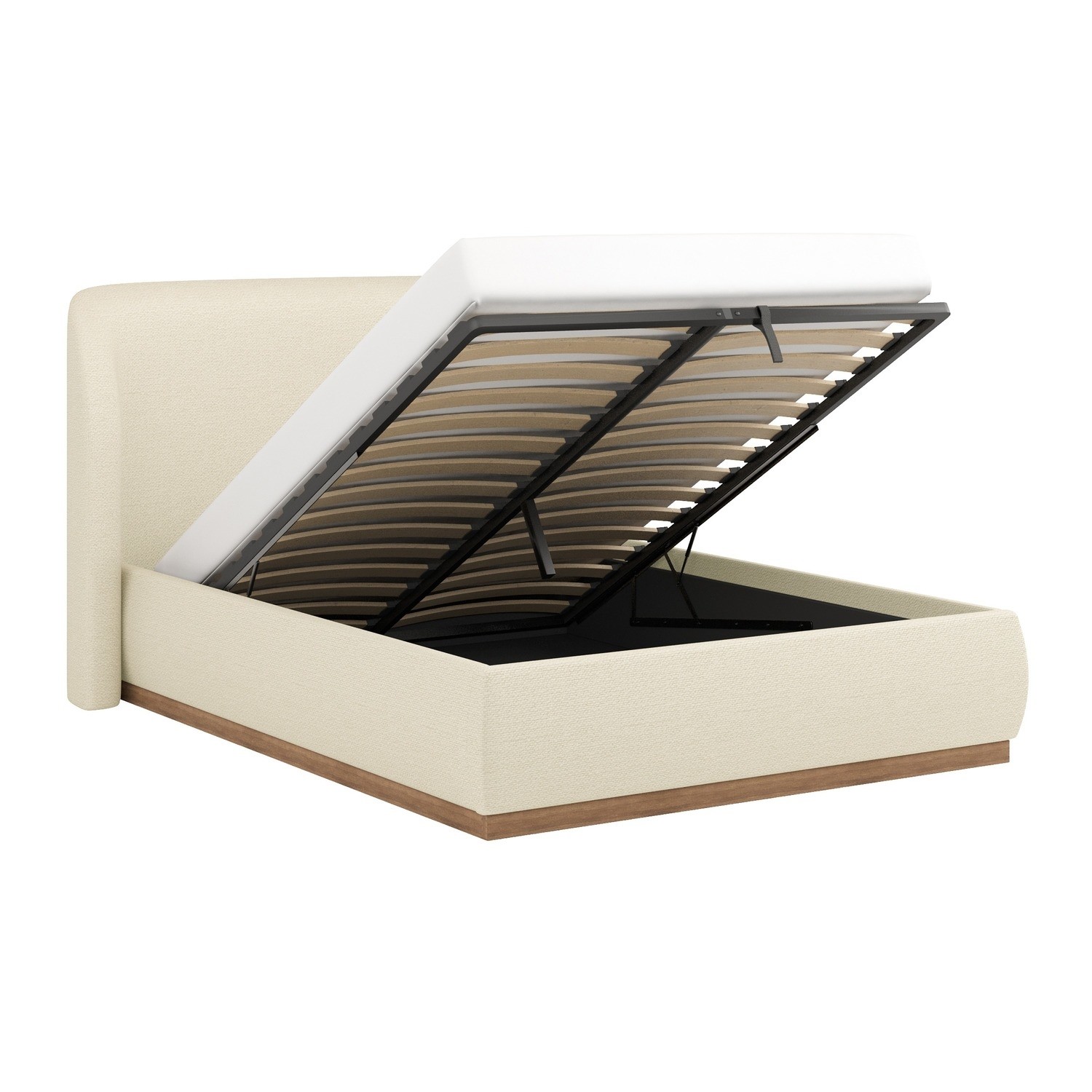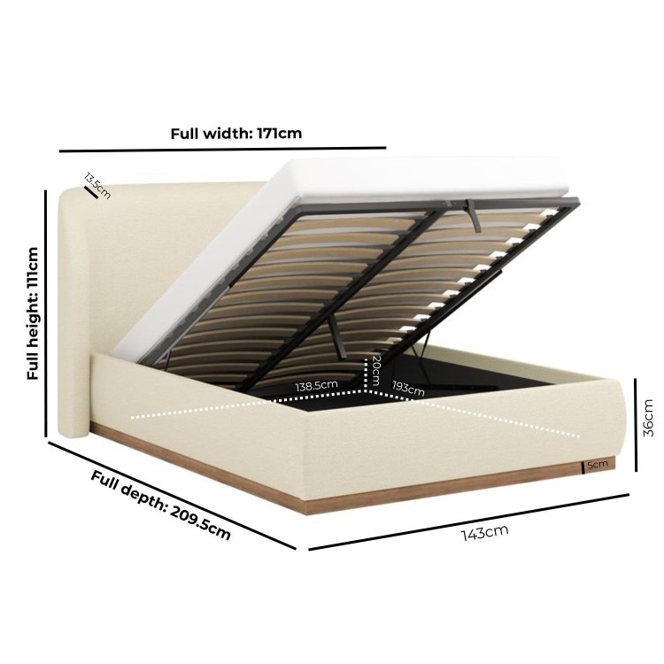 Blending comfort with contemporary design, this ottoman bed makes a statement in any bedroom. The curved upholstered headboard adds a soft, contemporary elegance that instantly elevates the space, while its generous padding delivers a luxuriously plush feel for relaxing or reading in bed. The walnut-effect plinth base introduces a subtle mid-century influence, bringing warmth and texture that beautifully complements the fabric upholstery. Beneath the sprung slatted base, a spacious hidden storage compartment offers a practical solution for keeping spare bedding and essentials neatly tucked away. Combining elegant styling with everyday functionality, this ottoman bed is perfect for creating a serene, minimalist bedroom that feels both refined and inviting.