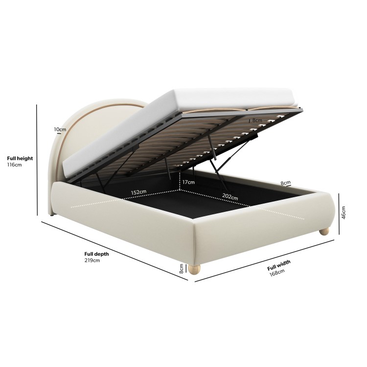 Create an aesthetic haven in your bedroom with the Nora Cream Velvet King Size Ottoman Bed. This bed features a plush, curved headboard with refined piping detail, providing a comfortable and stylish focal point for your bedroom. Supporting the bed are round, light wood feet, adding a touch of natural warmth. The spacious ottoman storage makes it easy to keep things organized and out of sight and it has a solid storage base for durability. This bed fits a UK standard double-size mattress.