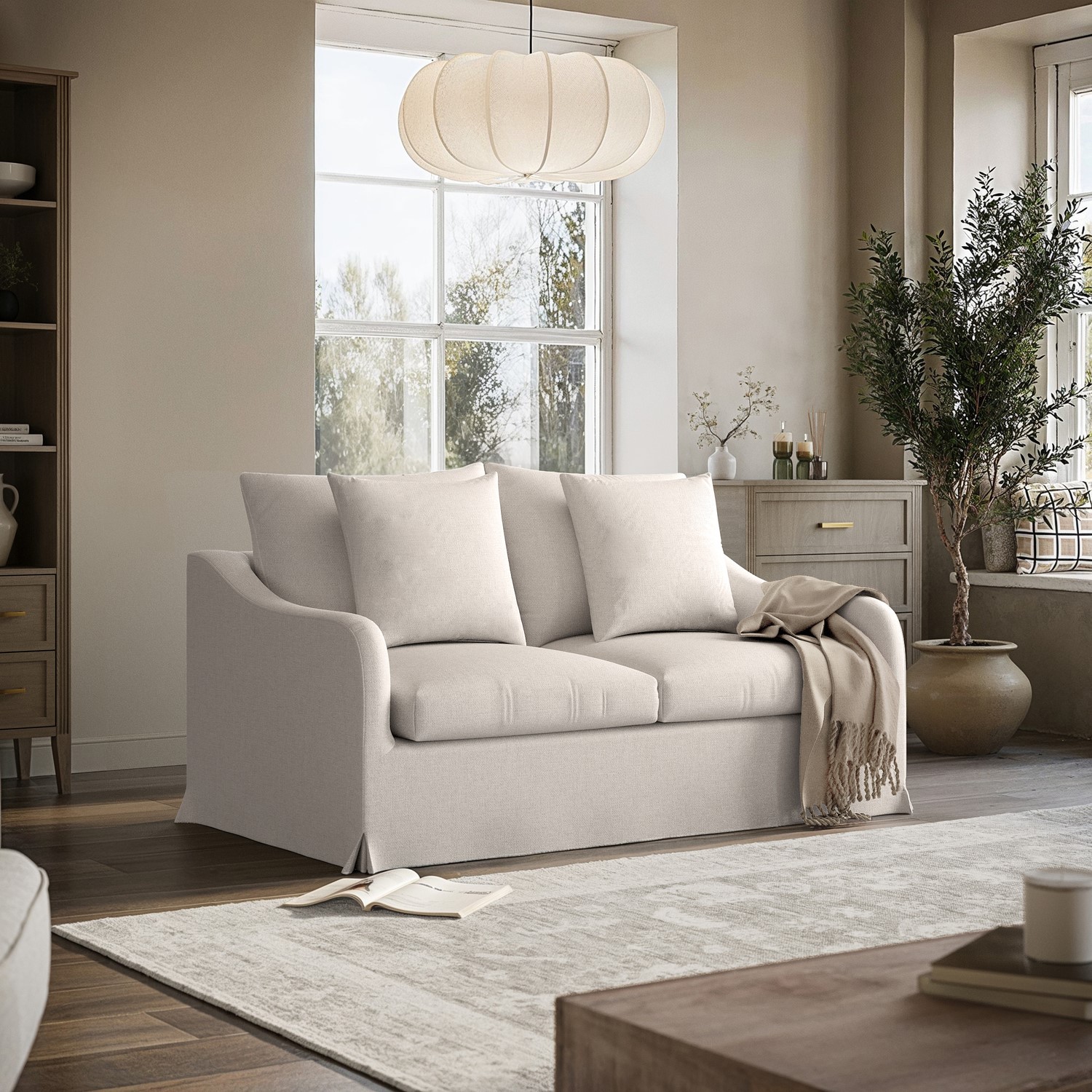 Timeless neutral style: Upholstered in a soft cream loose cover fabric, its timeless neutral shade and gentle curves blend effortlessly with any interior style.