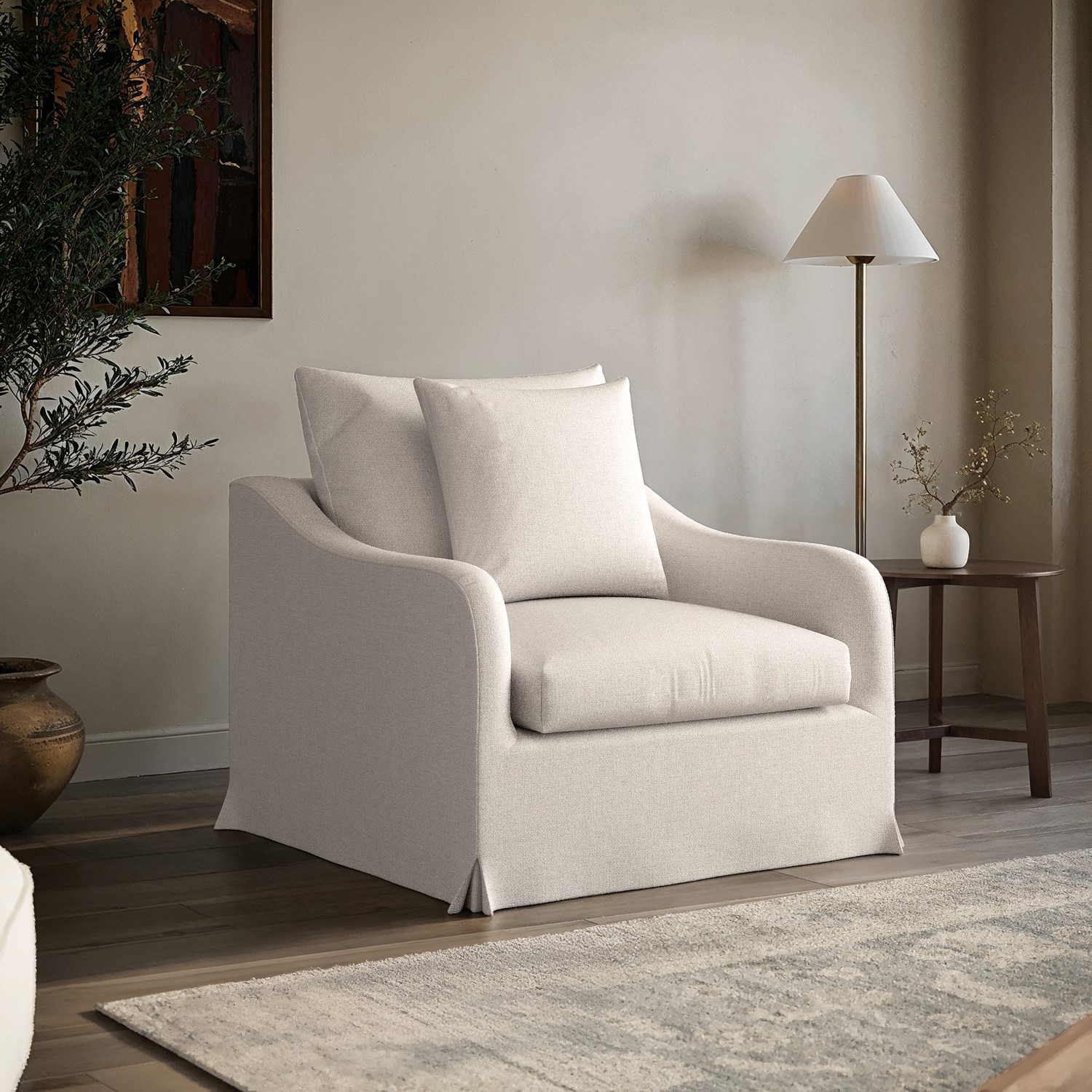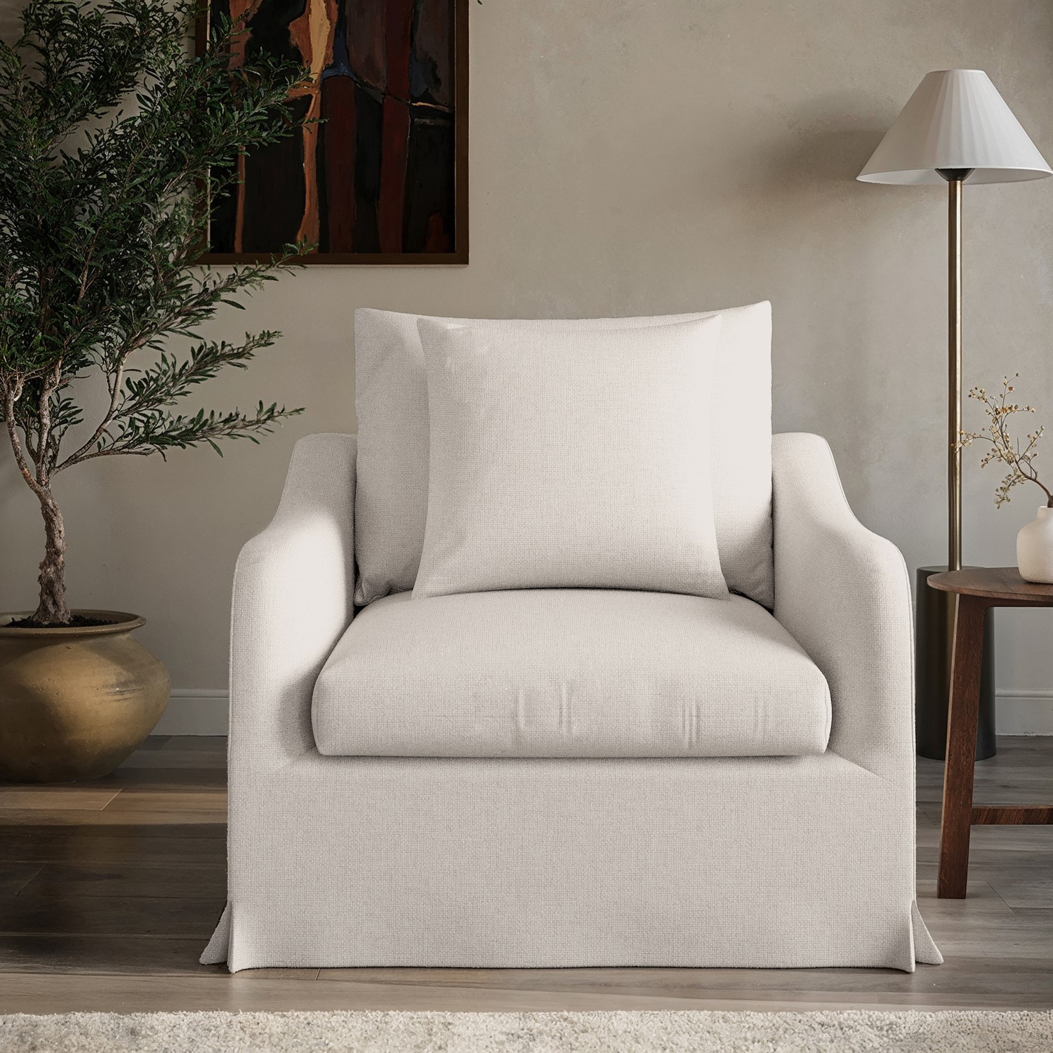 The Eliza armchair blends minimalist design with everyday practicality. Upholstered in a soft cream fabric, it’s a versatile addition that complements any decor. Its loose, easy-clean slipcover is removable, perfect for busy homes with children or pets. Its gently curved arms, skirted detail and soft silhouette bring a modern, relaxed feel, while the spacious seat and scatter cushion provide comfort and support. For added convenience, the back cushion and scatter cushions are fully reversible, ideal for maintaining a fresh look with ease.