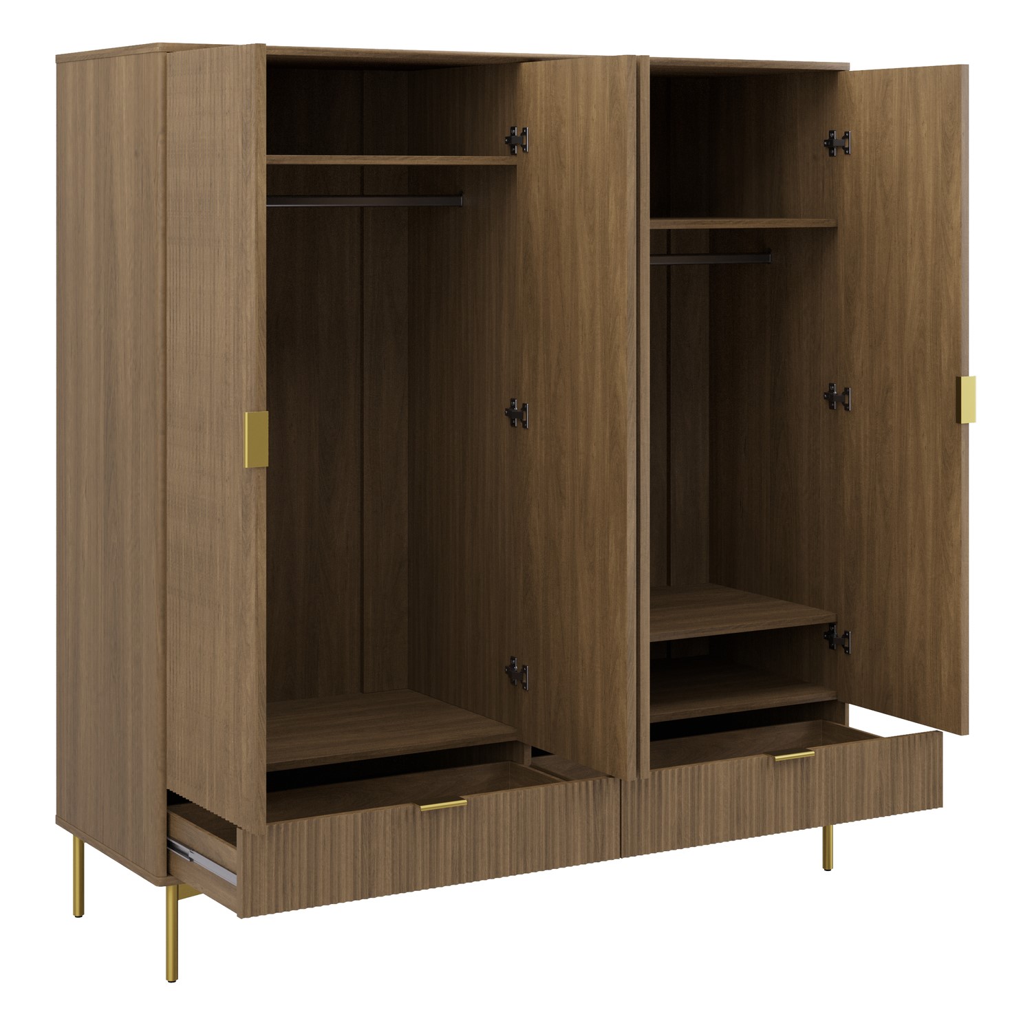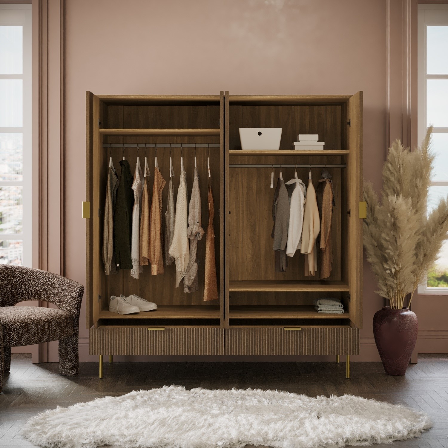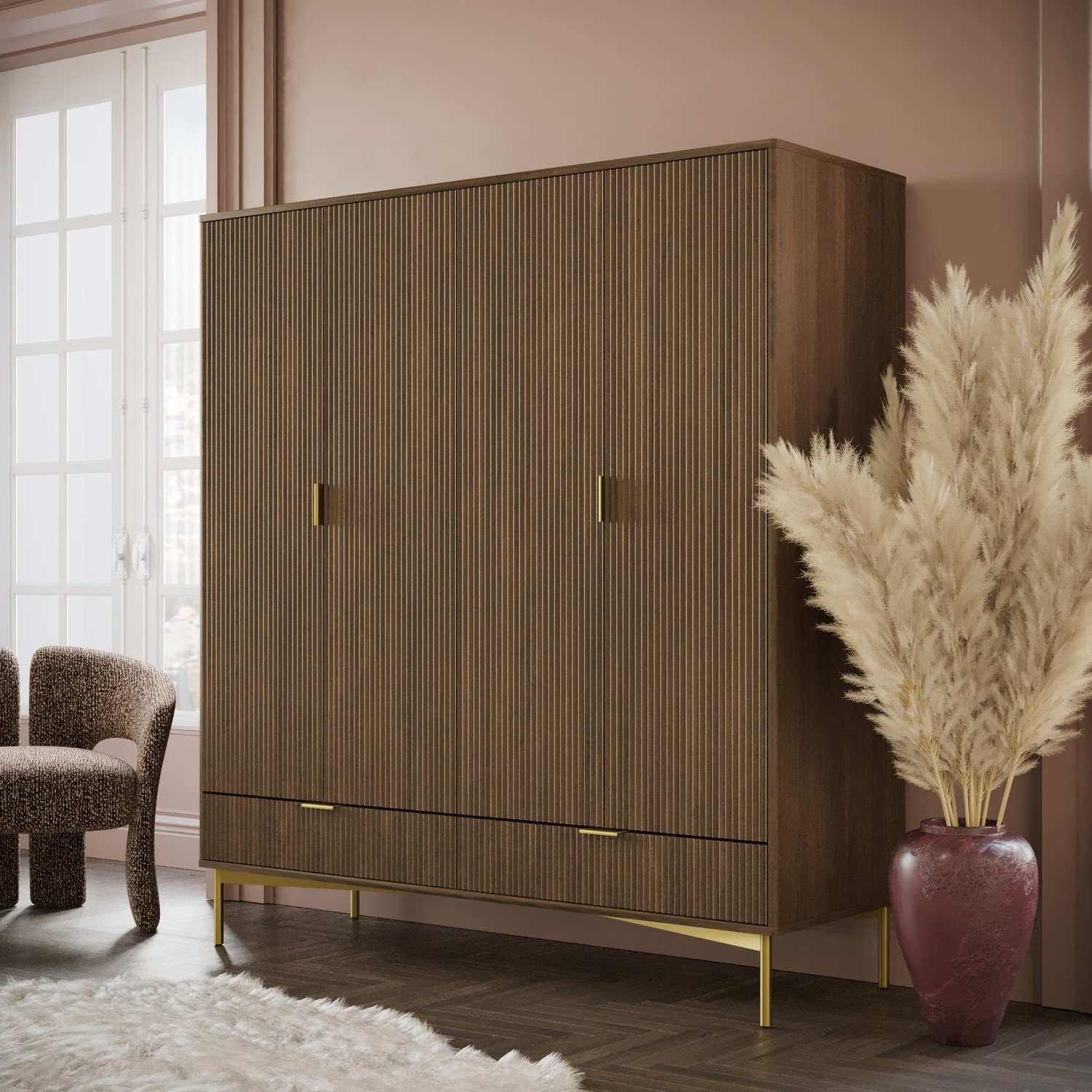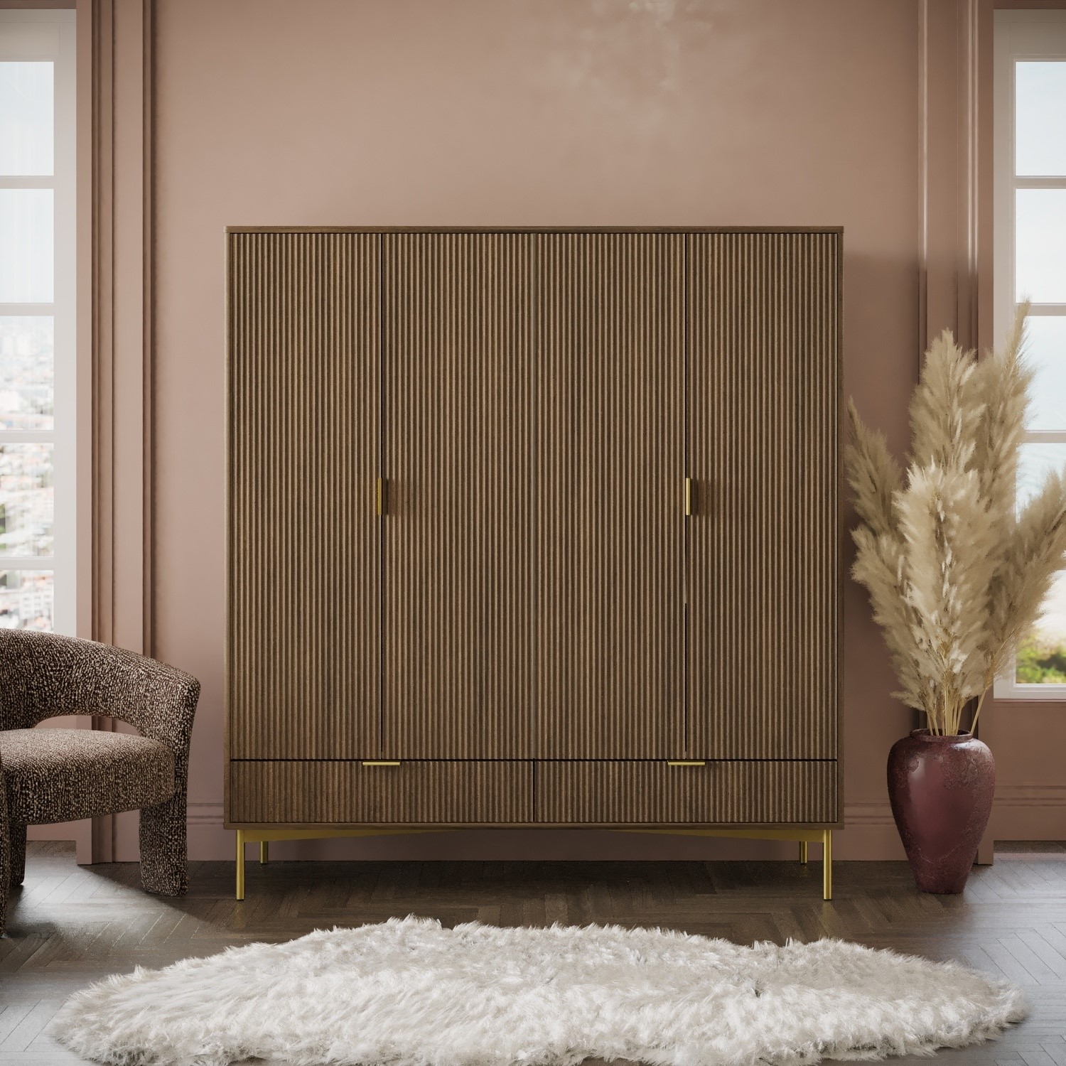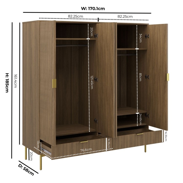 The Valencia 4-Door Wardrobe offers a sleek and practical storage solution for modern bedrooms. Finished in a dark oak effect, it brings natural warmth and texture, while ribbed door fronts add a contemporary, refined look. A versatile mix of two hanging rails, three internal shelves and two spacious drawers provides generous storage for clothing, bedding, and everyday essentials. Smooth metal runners ensure effortless drawer use, and gold handles and legs complete the design with a subtle touch of luxury. Crafted with durability in mind, this wardrobe is built to last.