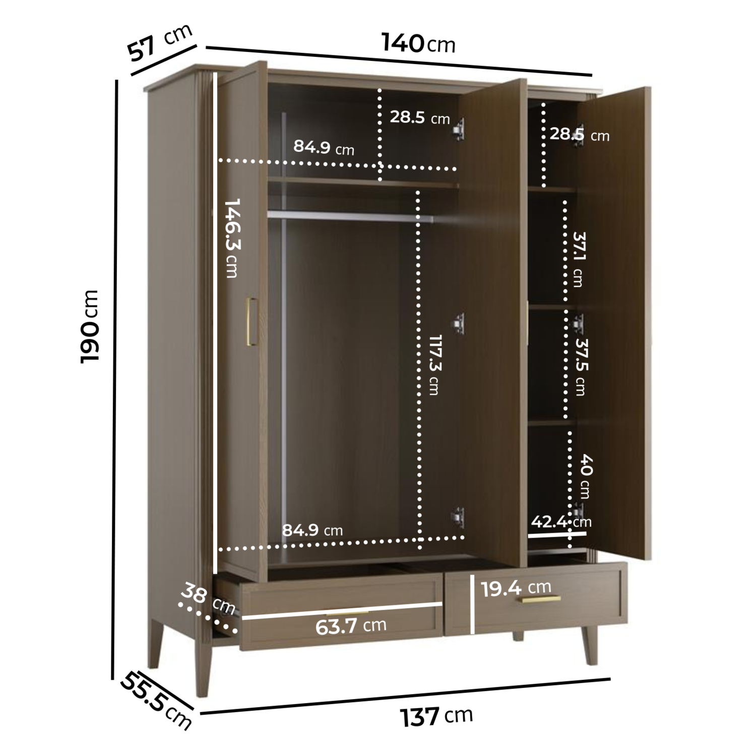 - Dimensions: W140cm x D57 x H190cm