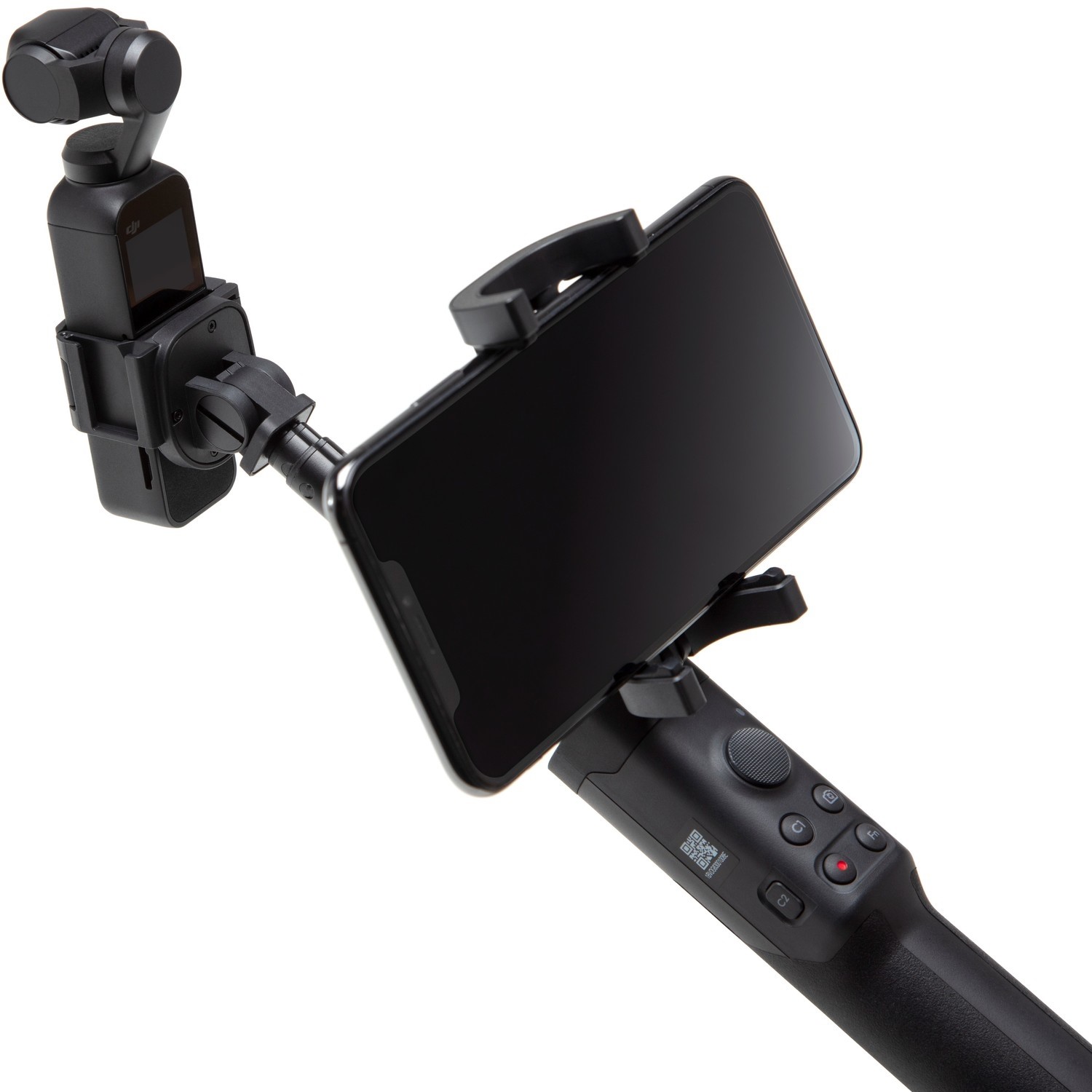 You can attach your phone to the phone holder, and use an Osmo Pocket Wireless Module or a connection cable (both sold independently) to control Osmo Pocket with the extension rod. The extension rod also features multiple mounting brackets for additional shooting options.