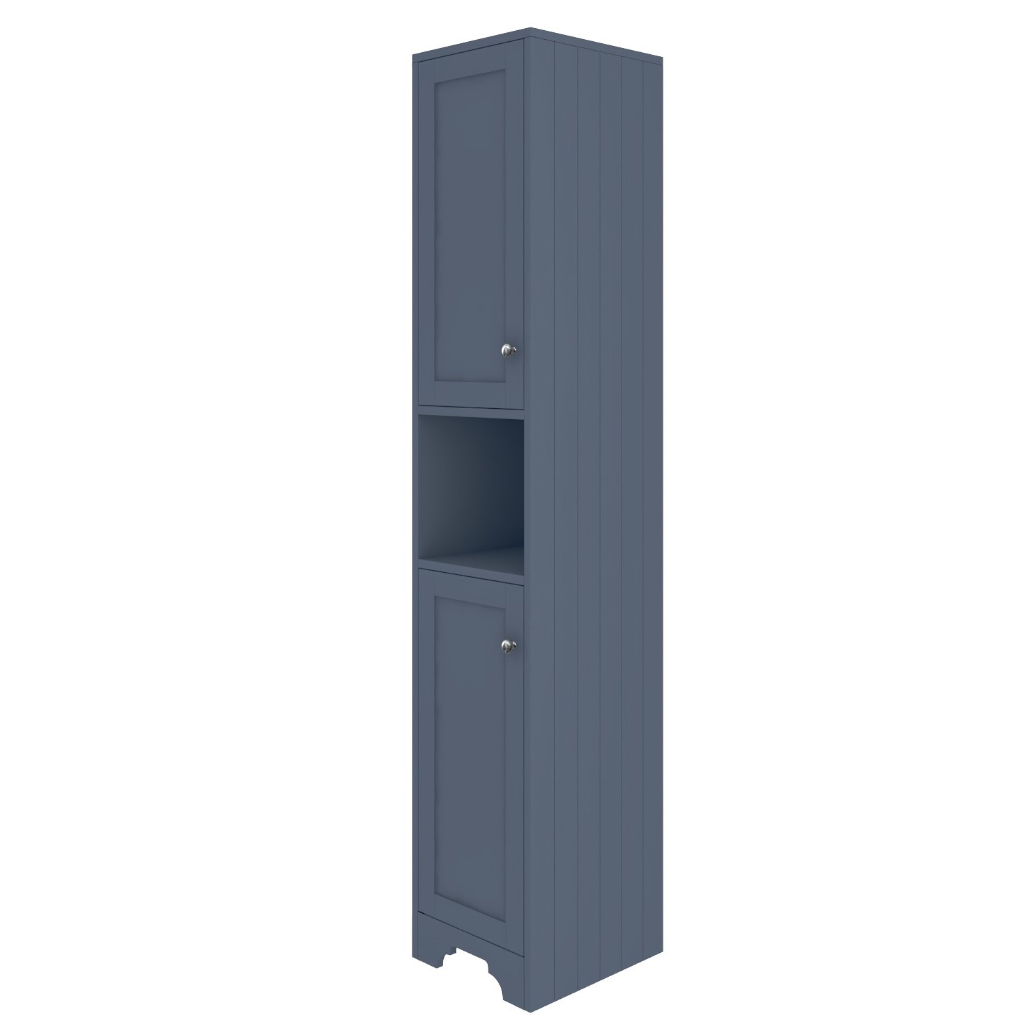 Update your bathroom with this tall Baxenden storage unit. Characterised by a classic tongue-and-groove side panelling, the ornate front skirting and a matt blue finish, it has that traditional meets modern styling that'll look great in any style of bathroom. Two cupboard doors, each with a stylish metal button handle opens to reveal generous storage space for all your bathroom essentials and more. There're even soft-closing hinges to prevent them from slamming, providing a quieter closure. The open storage is ideal for display. It matches a wide range of other Baxenden products to complete the perfect look.