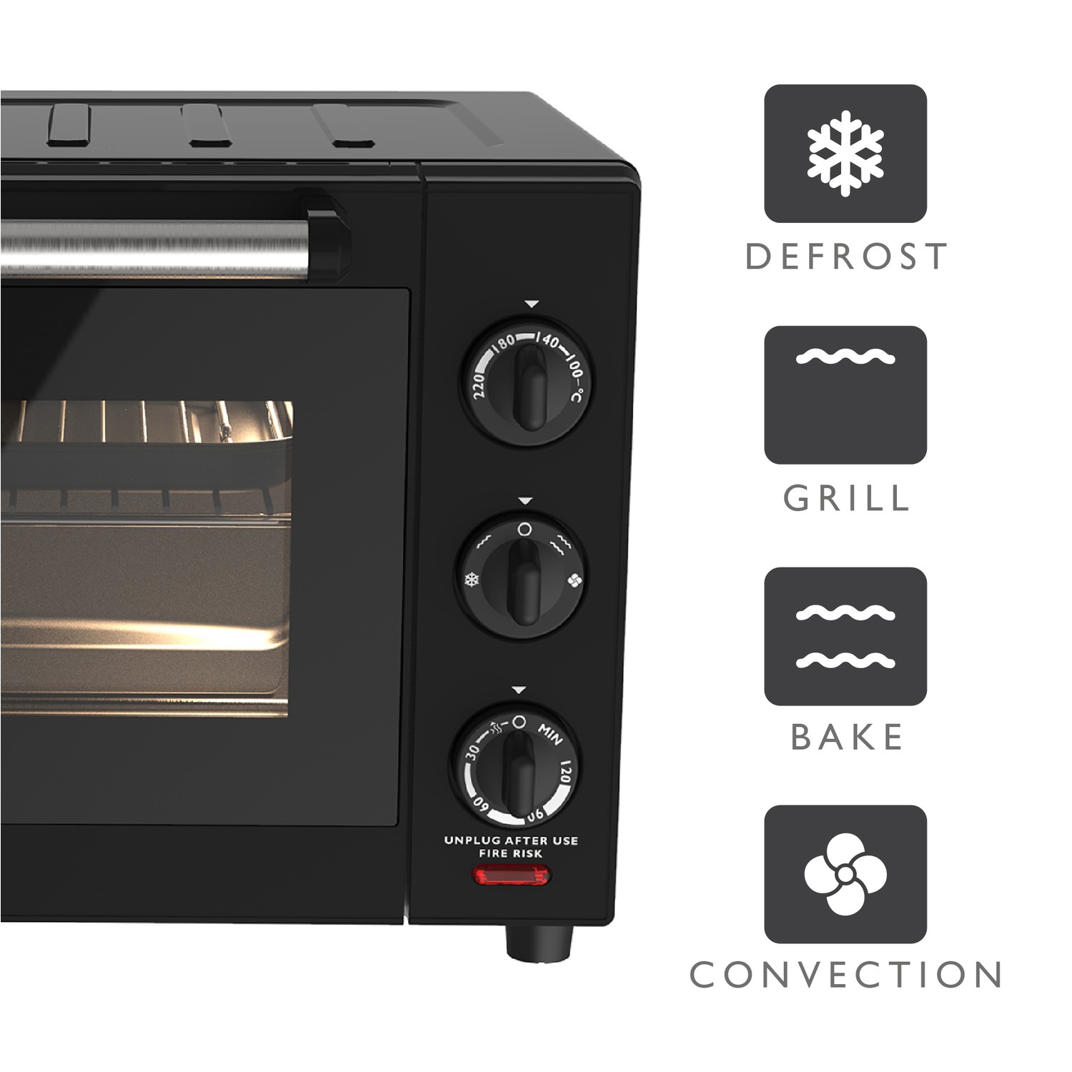 - Defrost, grill, bake and convection cooking functions
