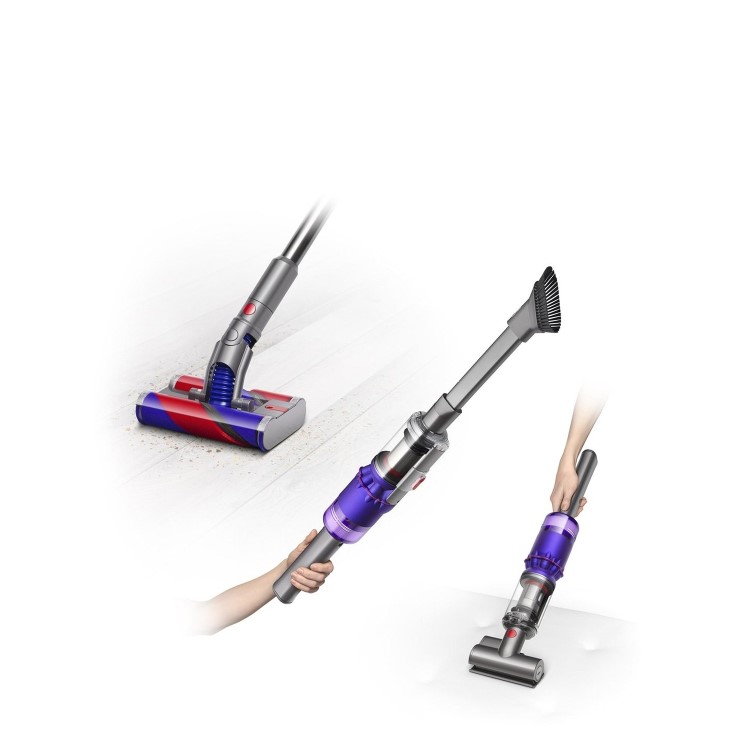 Dyson's first omnidirectional Fluffy™ cleaner head has two motorised Fluffy rollers to pick up everything from large debris to fine particles.² It glides effortlessly in all directions – forwards, backwards, even sideways.