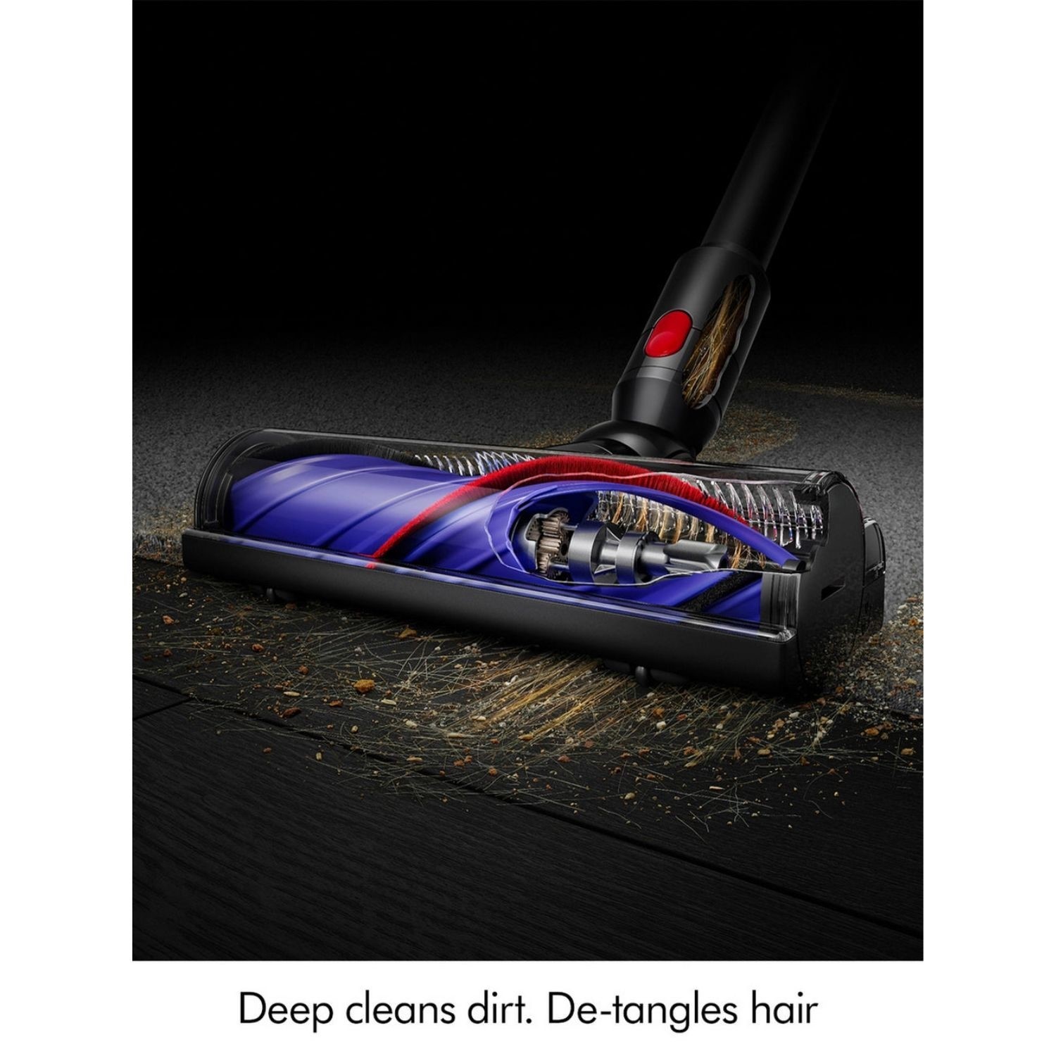 Equipped with the innovative Motorbar™ cleaner head, the Dyson V8 Cyclone deep-cleans carpets and hard floors while automatically removing wrapped hair as you clean. Polycarbonate hair-removal vanes lift hair and debris directly into the bin — reducing maintenance time and making it especially useful for homes with pets.