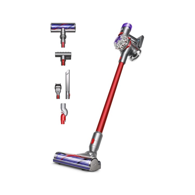 V8 Extra Cordless Vacuum Cleaner with extra tools for carpets and cleaning under low items.