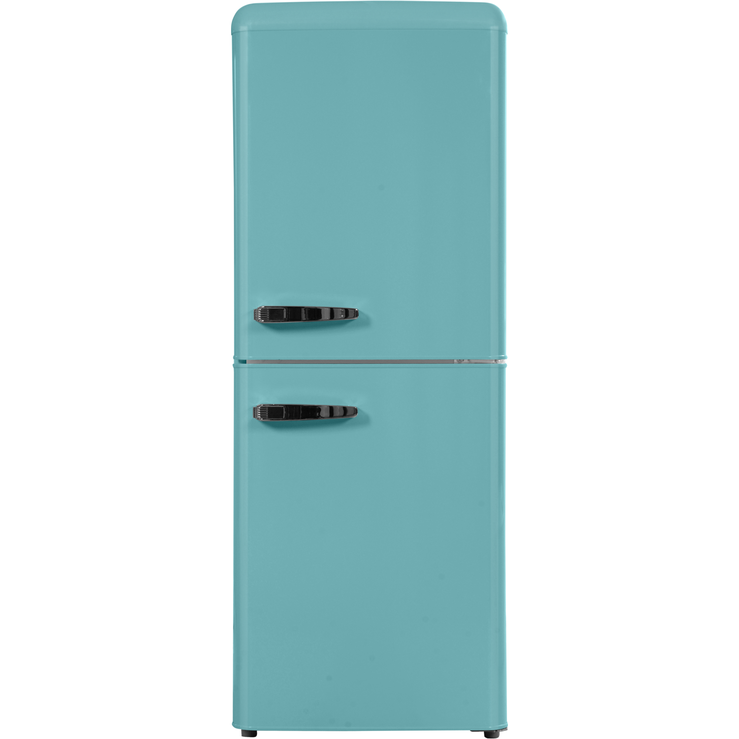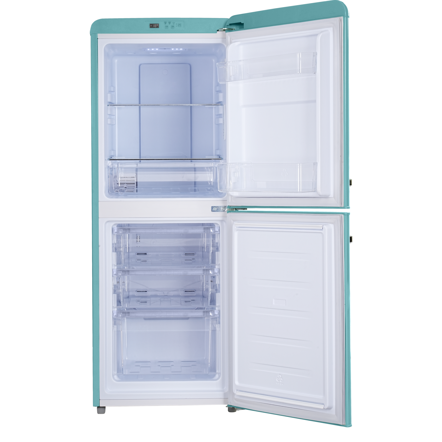 This stylish freestanding fridge freezer combines a retro-inspired design with modern features, making it an excellent choice for anyone seeking an aesthetic yet functional addition to their kitchen. Its blue-colored finish, paired with chrome handles, gives it a timeless look. With 153L of total storage capacity, this appliance is perfectly sized for smaller households or as a secondary unit. The 93L fridge compartment includes one shelf, a crisper drawer, and door balconies for organizing your essentials. The 60L freezer section offers three transparent drawers, making it easy to sort and access frozen goods.