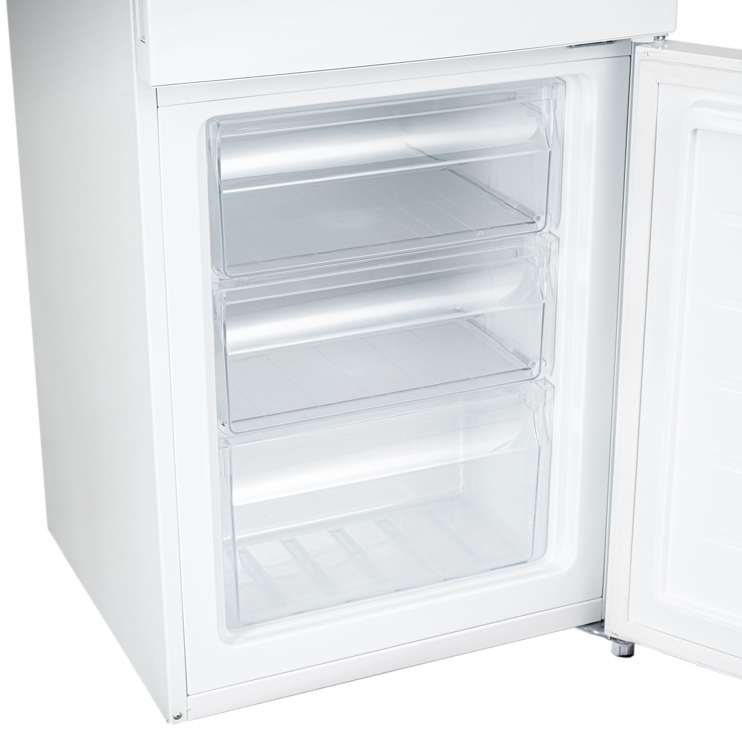 The Low Frost system helps minimise ice build-up, reducing the need for manual defrosting, while the Fast Cool and Fast Freeze functions rapidly bring newly added groceries to the right temperature. Inside, the fridge offers three shelves for organised storage, while the freezer includes three clear drawers, allowing you to neatly separate and access frozen items. Finished in classic white with reversible doors, it adapts easily to different kitchen layouts. Quiet 39dB operation and an E energy rating ensure efficient, everyday performance.