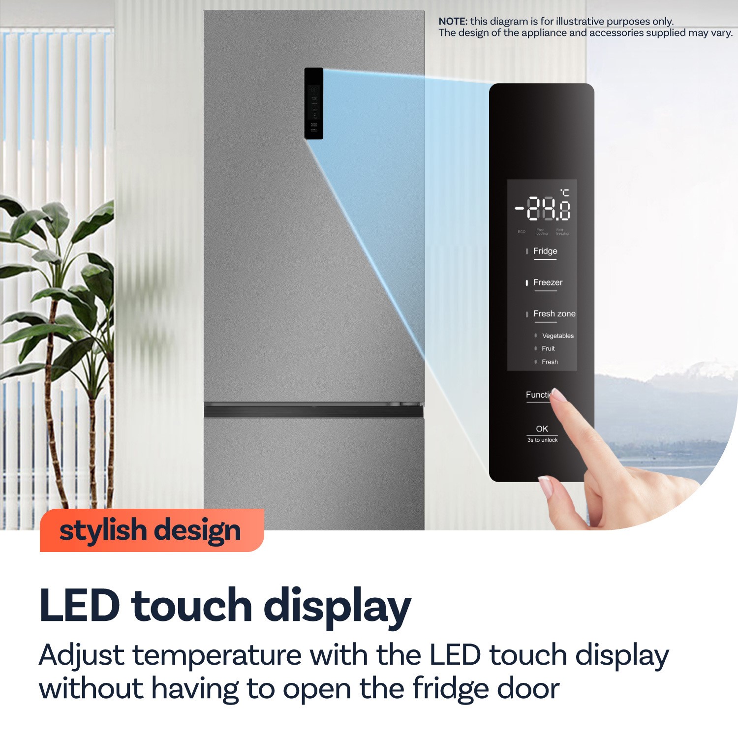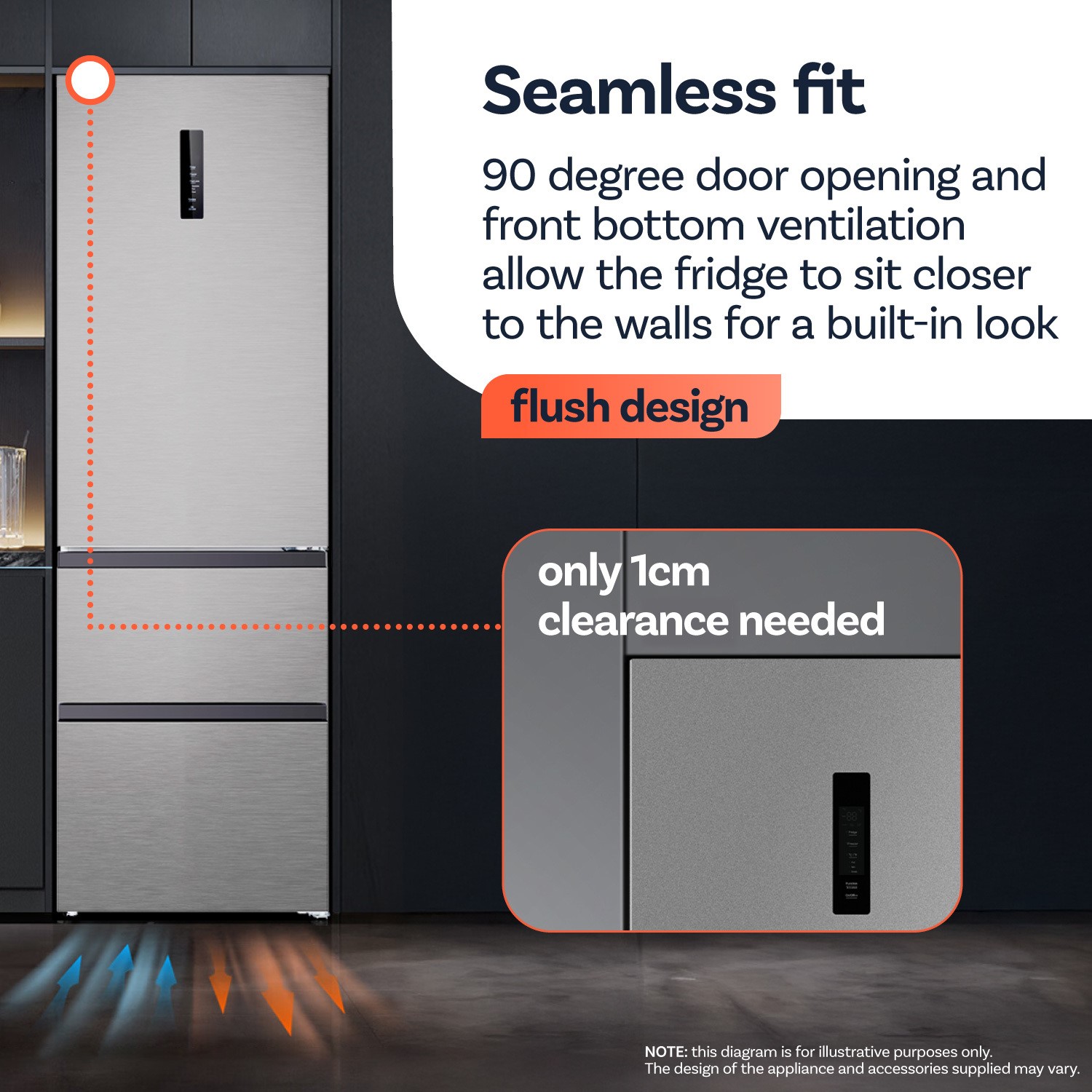This electriQ freestanding fridge freezer is designed for a seamless fit in any kitchen. The flat door design creates a flush, stylish look, while the 90° door opening gives you full access even in tight spaces. Bottom heat dissipation allows the unit to sit closer to the wall, enhancing that built-in appearance.