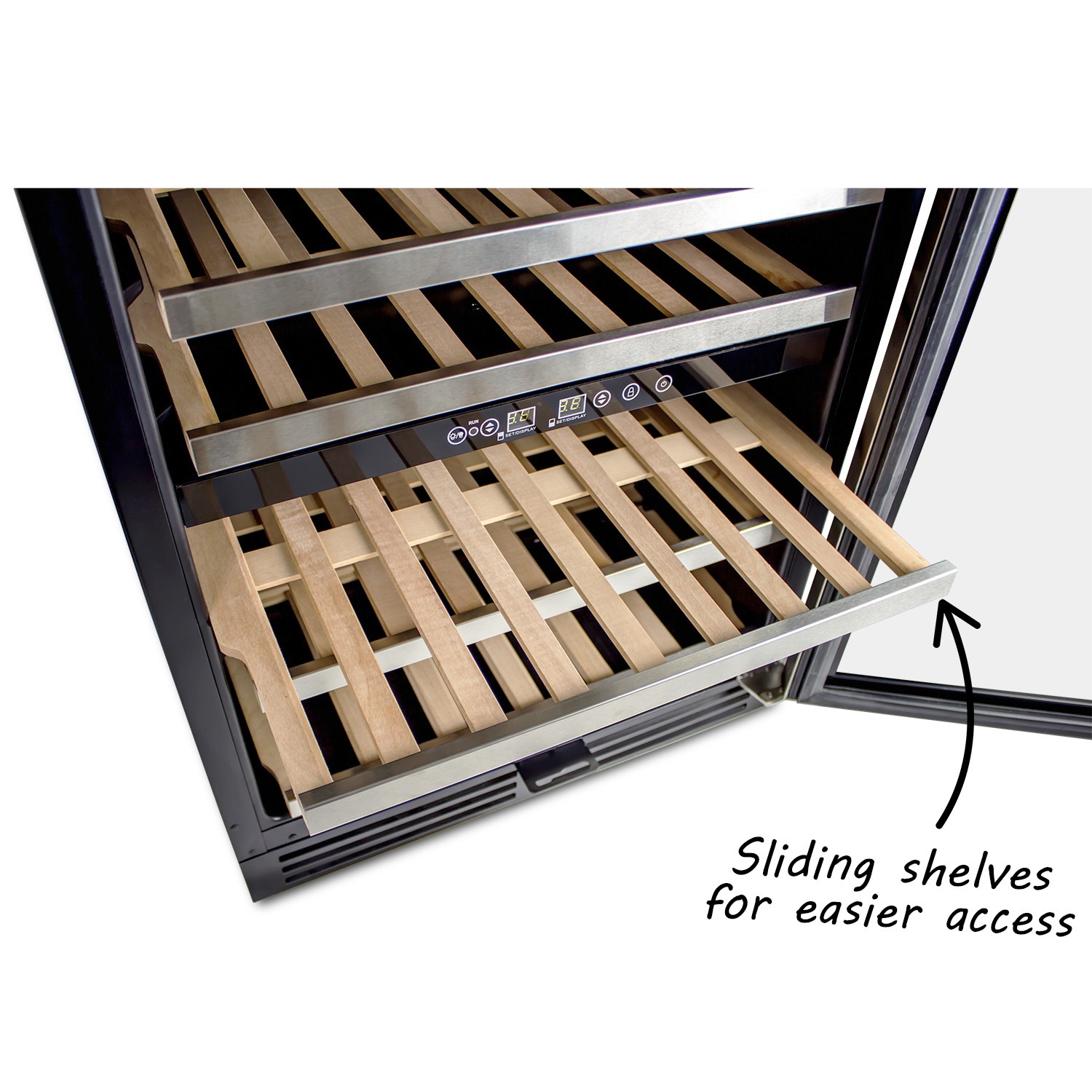 This quality wine cooler from electriQ holds 5 full and 1 half solid wooden shelves. The shelves can be slid out, enabling you to take a closer look at the bottle you're selecting.