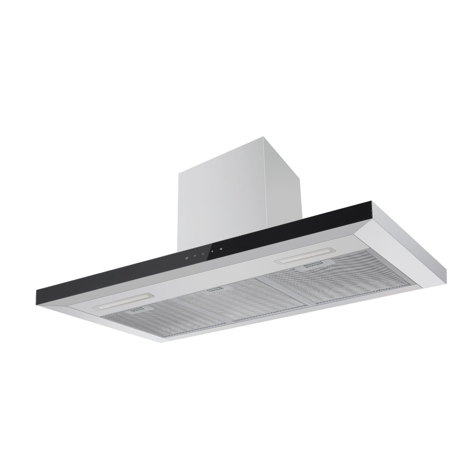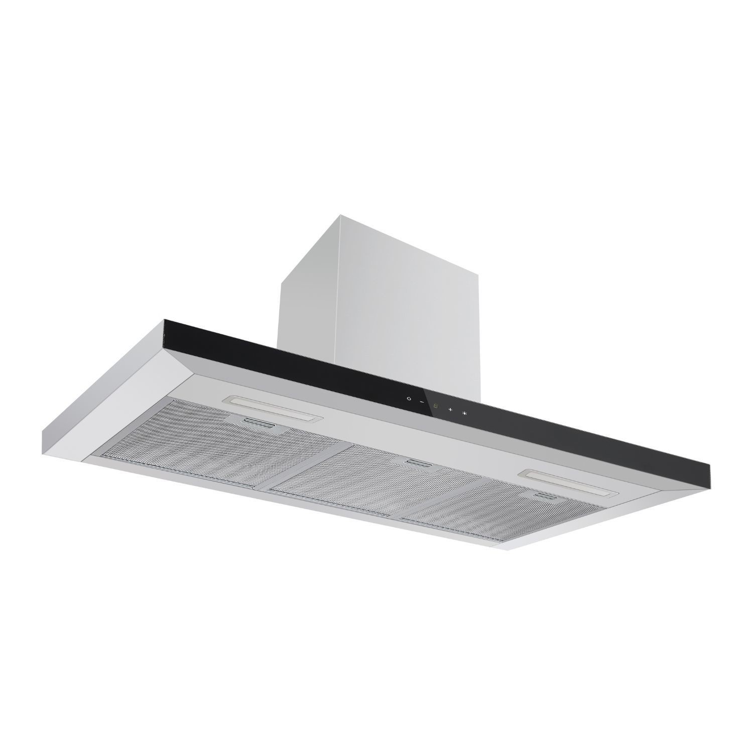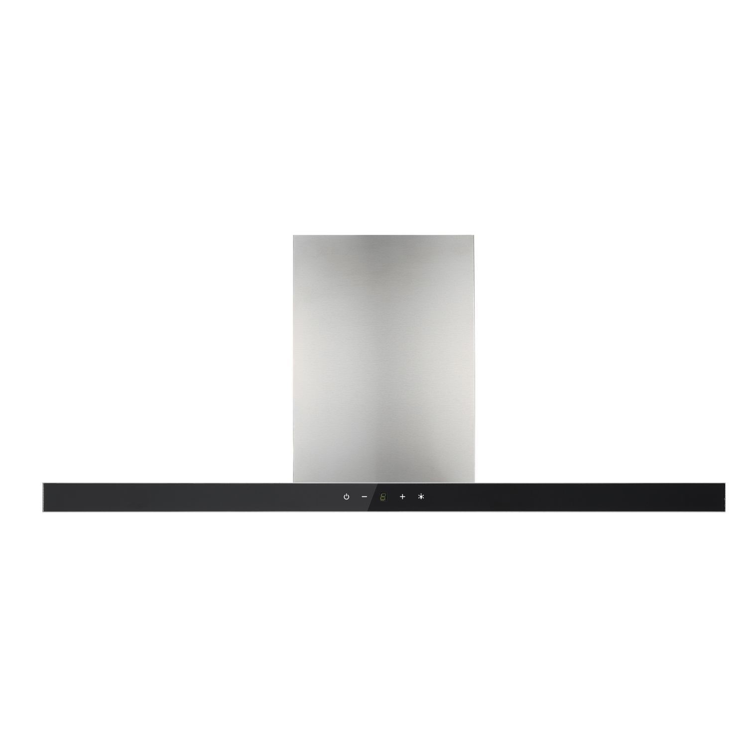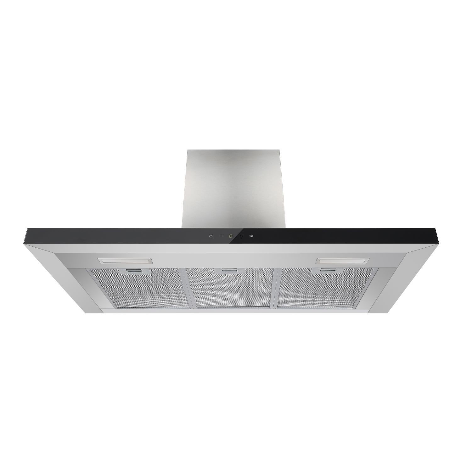 - Sleek modern wall-mounted hood with touch controls and LED lighting