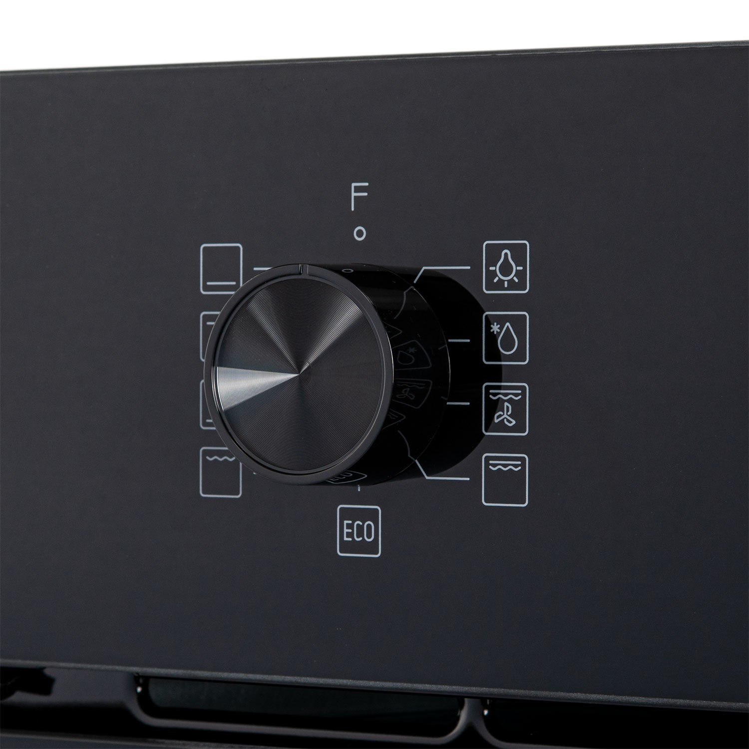 - Functions: Defrost, Top + bottom heat, Bottom heat, Top heat, Top + bottom + fan, Grill, Double grill, Double grill + fan