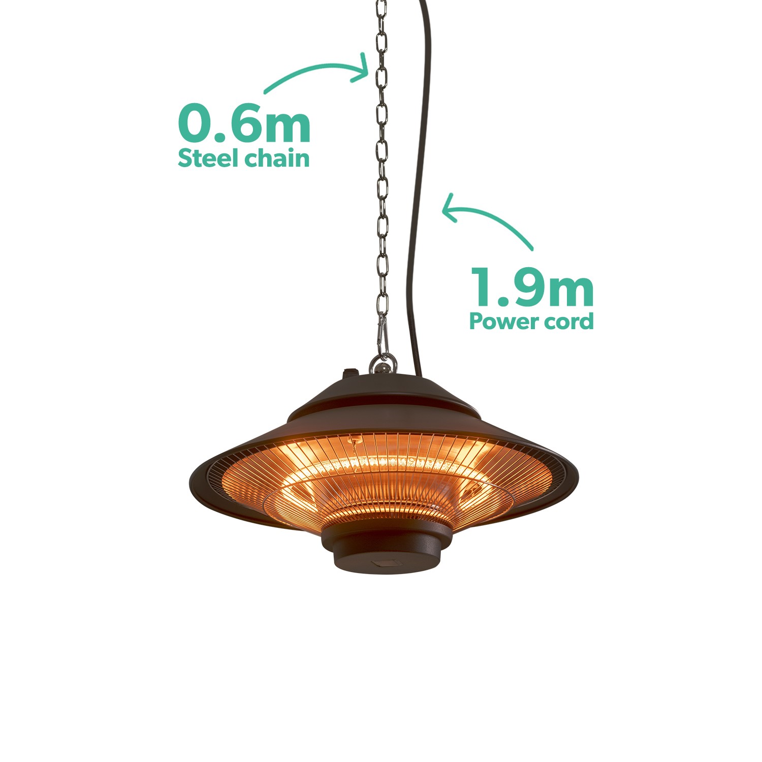 This hanging patio heater offers a simple and safe solution to keep you warm on your patio, decking, or simply in the garden, all year round. Featuring clear aluminium heating elements which delivers instant heat. The build quality of this heater is very high with aluminium and plastic build, plus it’s lightweight design makes installation much easier. This patio heater can be paired with a BBQ, patio furniture or near your back door, making it a great addition to any garden, with a unique hanging design.