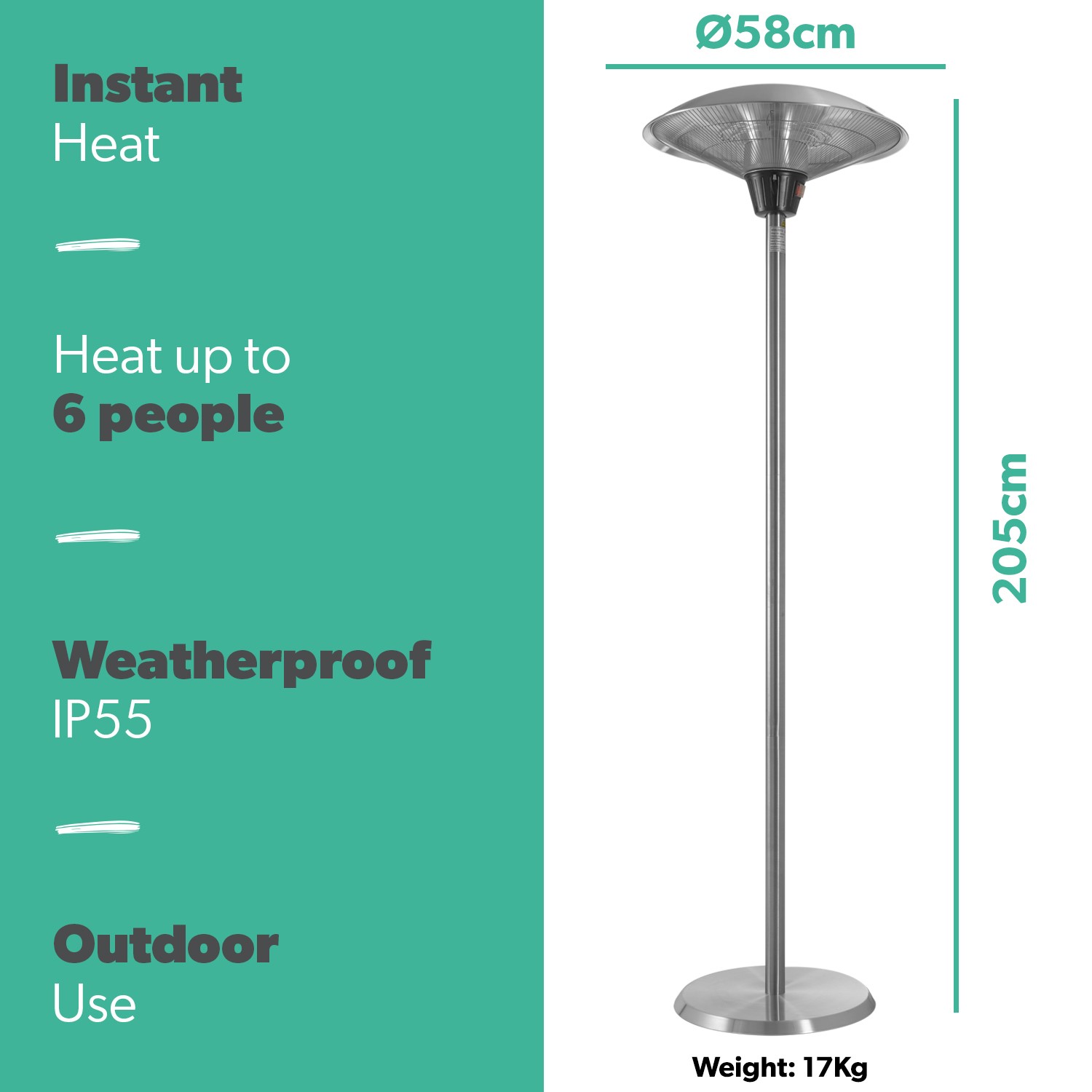 The IP55 waterproof rating is perfect for keeping the fun going even in poor weather. This sleek, silver patio heater can be paired with any BBQ and patio furniture, making it a fantastic addition to any garden.
