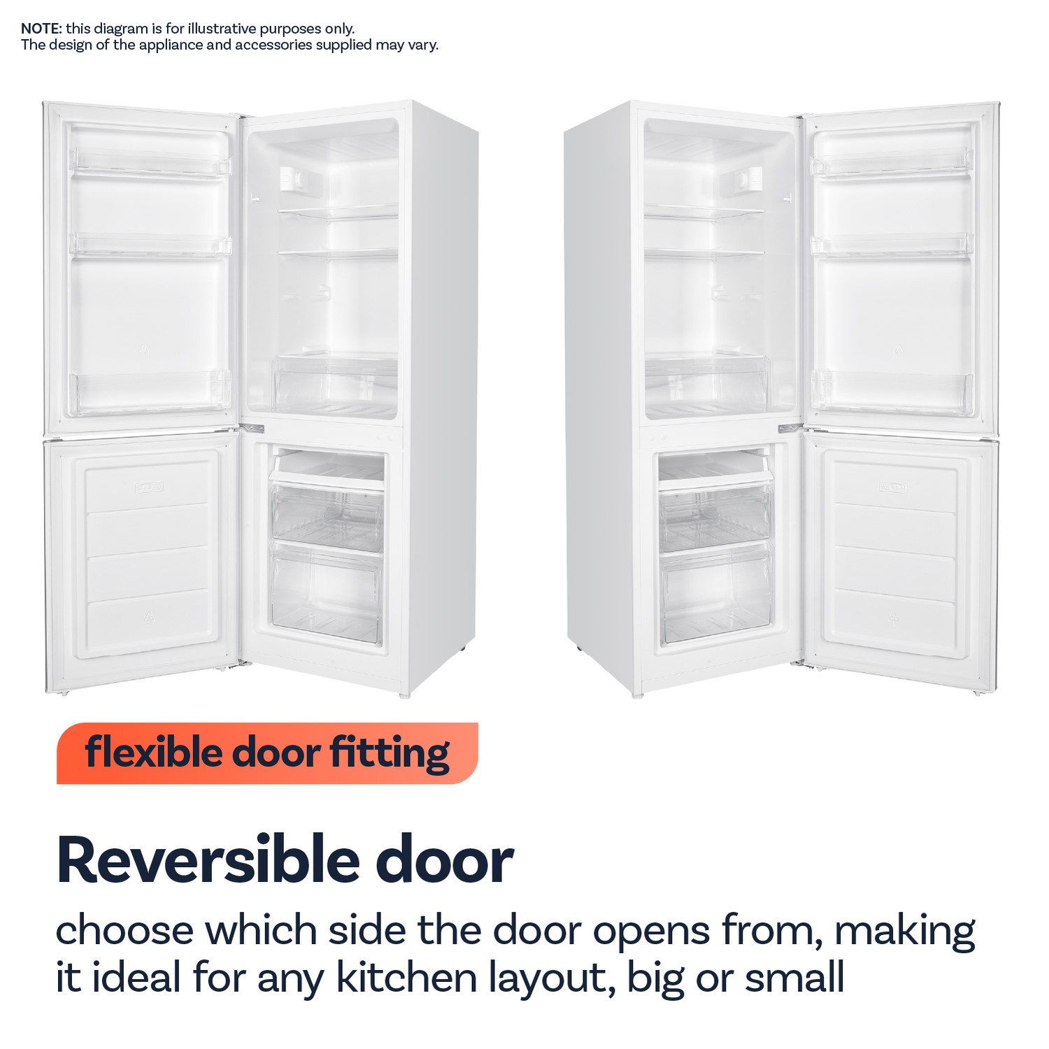 Reversible doors allow you to swap the hinges and handles, so the door opens from the opposite side for a perfect fit.