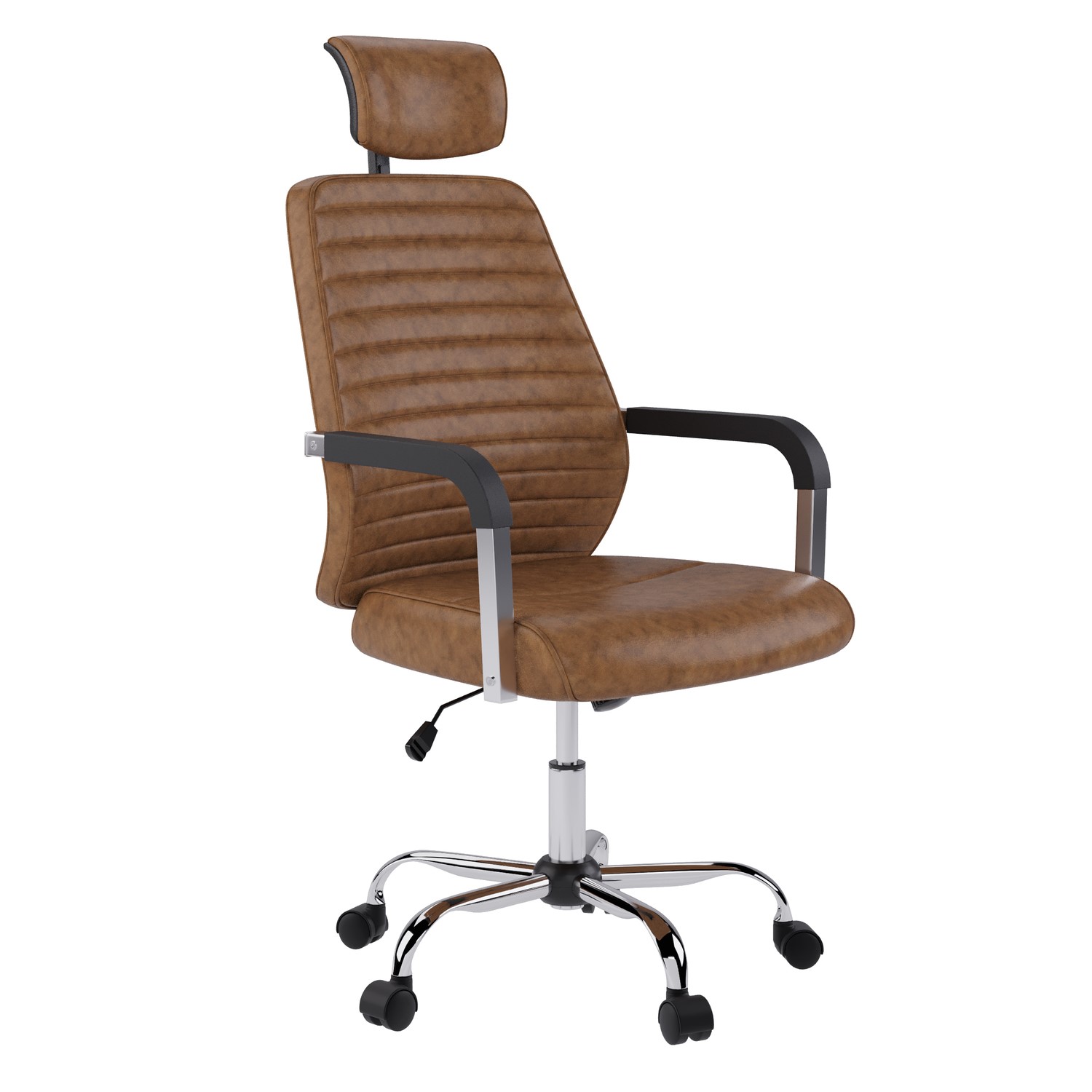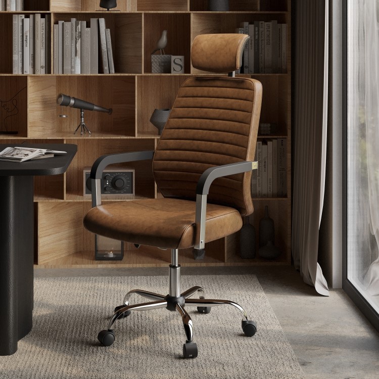 Elevate your workspace with the sleek style and professional comfort of the Emmanuel Swivel Office Chair, featuring a high backrest. Upholstered in soft and durable brown faux leather with refined ribbed detailing, it adds a modern, professional touch to any room. The ergonomic design, high backrest, and integrated headrest deliver excellent support for posture and comfort, while padded armrests provide extra ease during long working hours. With adjustable height, castor wheels, and a 360° swivel, it offers freedom of movement and everyday flexibility, whether you’re working or relaxing.