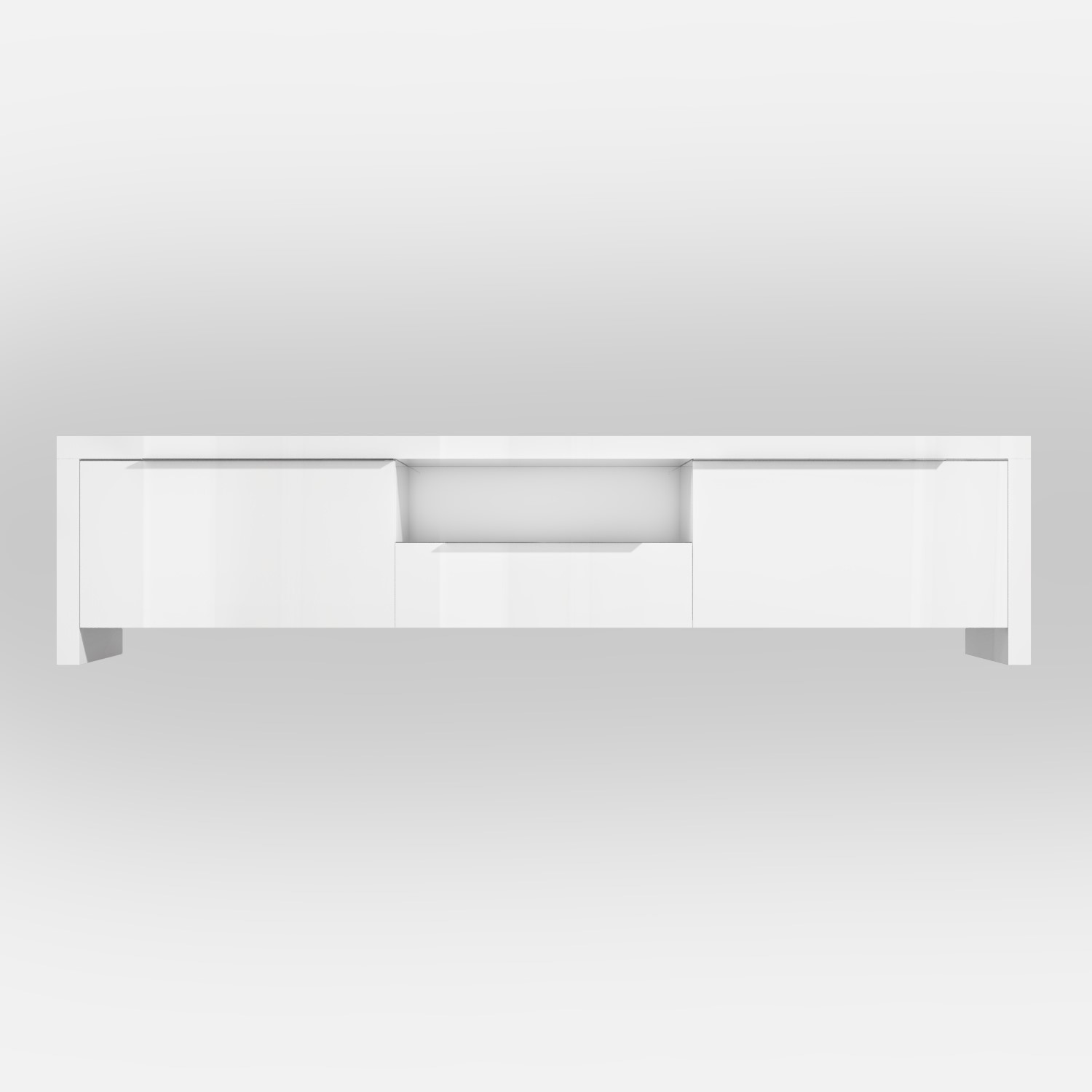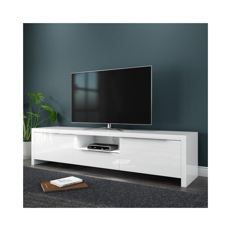 With a clean design and fresh white finish, the Evoque TV unit will bring a modern touch to your space. The sleek high gloss complements the simplistic style of the design perfectly whilst enhancing the space with its natural shine. It's equipped with a variety of practical storage options for all your media, including three cupboards and a central shelf that come with wire tidy holes to the rear, allowing you to discreetly thread through any cables out of the way. The Evoque gloss TV Unit holds TVs up to 70 inch.