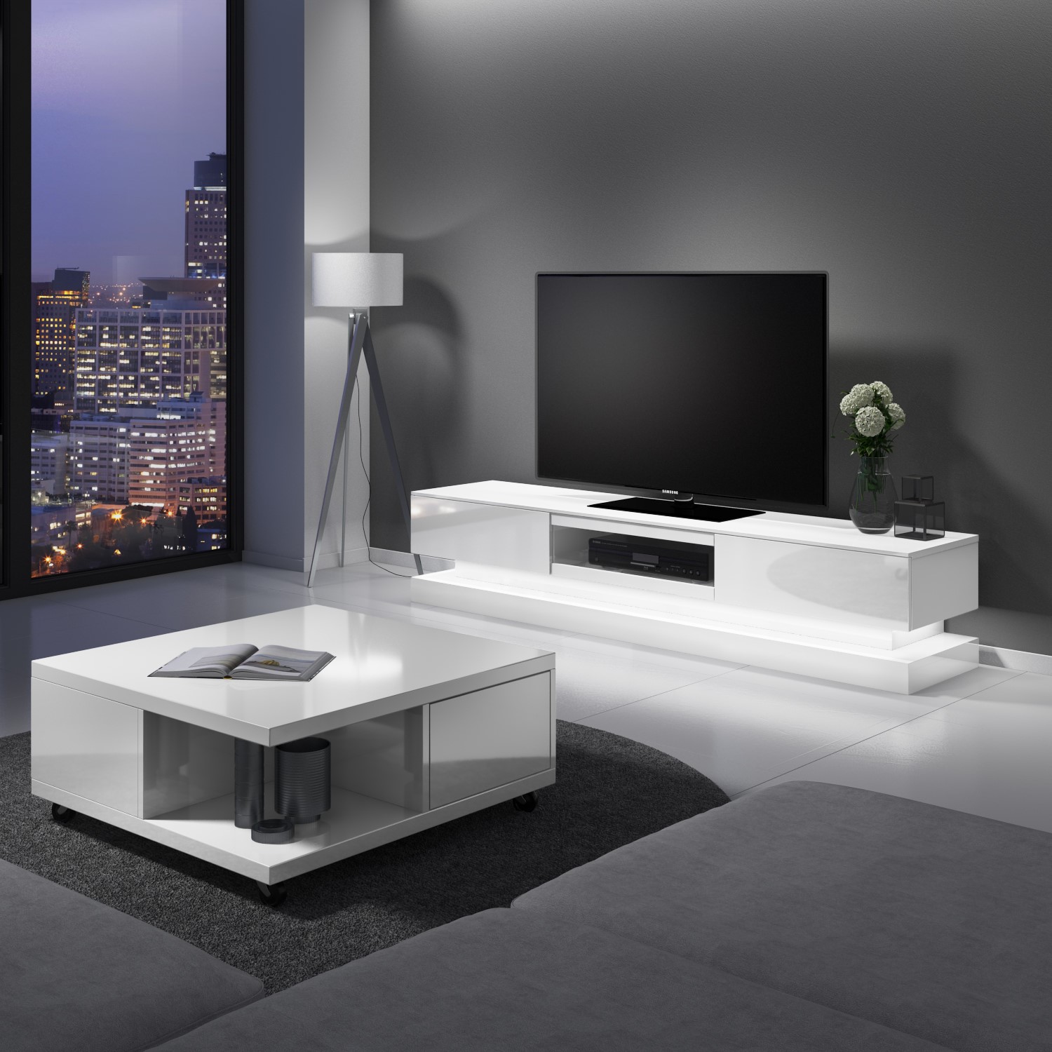 Instantly rejuvenate your space with this stunning TV unit from the Evoque range. The wide design is ideal for supporting flat screen TV's of all sizes with display space to spare. Slim and sleek it takes up little floor space and with soft feet pads it even protects your floor. Ideal for the modern home, with its easy clean, fresh white finish and natural shine. Adequate storage is provided for media essentials and the central shelf makes it easy for you to hide away any unsightly wires to maintain a minimalist look.
