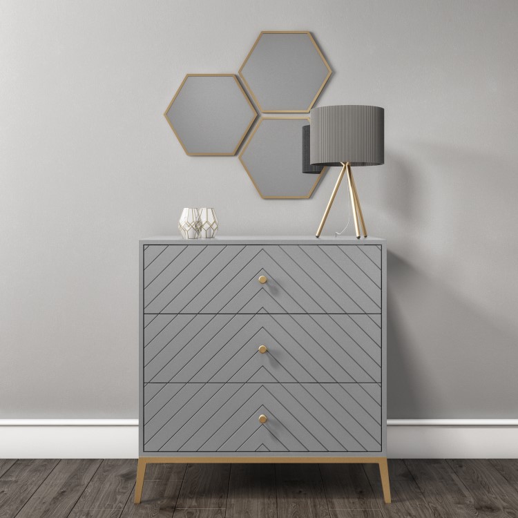 Give your bedroom an instant uplift with this beautiful art-deco inspired chest of drawers. It oozes effortless style with its eye-catching chevron drawer fronts and contrasting brass touches. Hand-finished and crafted from solid mango wood with muted grey tones, the chest of drawers keeps things clean and contemporary - ideal for both modern and more traditional styles. The three drawers are constructed with smooth wooden runners for added durability and provide plenty of space to store your clothes neatly away. Plus, the angled metal legs are coated with a brass finish, which really brings the whole piece together.