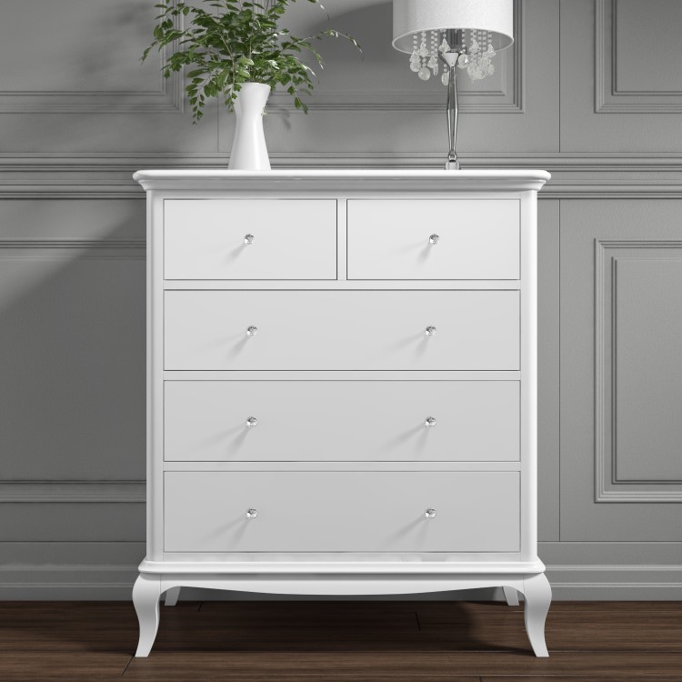 Featuring exquisite craftsmanship with curvaceous carved legs and opulent flared cornices, the Florentine 2+3 chest of drawers has an elegant and sophisticated aesthetic that will infuse your space with a sense of luxury. Hand finished in crisp delicate white it has a pure and tranquil essence. Crystal effect handles complete the designer look with a touch of glamour.