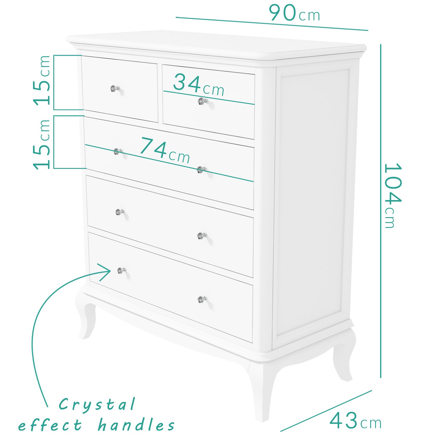 This charming design has been beautifully crafted using solid pine with a painted finish. It holds 2 smaller drawers at the top of the chest which are ideal for more delicate items of clothing and 3 full width drawers further down, giving plenty of space to organise folded items. The drawers have a robust build using dovetail joints and solid wooden runners and stoppers for great durability. Due to the solid nature of this piece there's absolutely no assembly required.