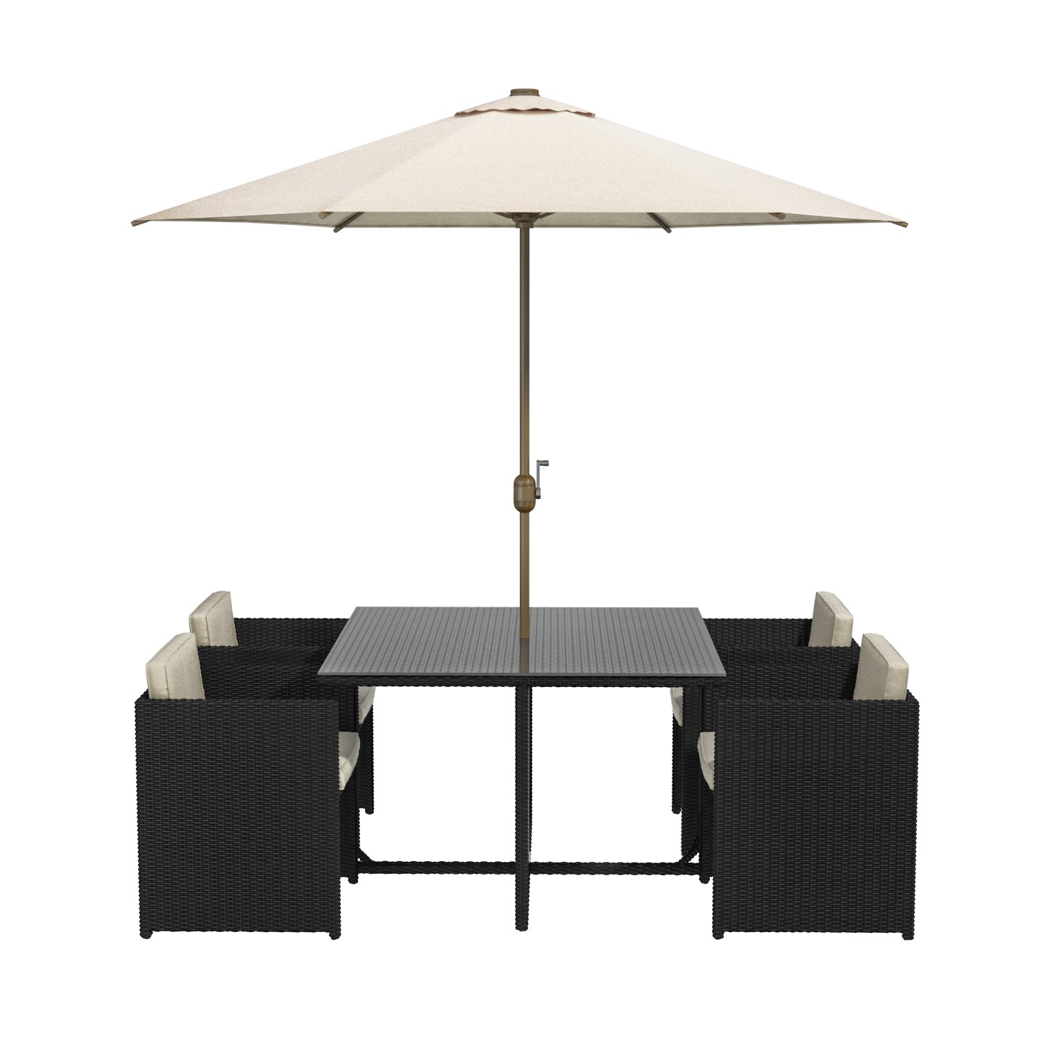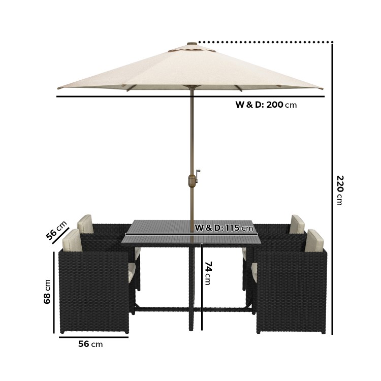 Make the most of your garden this summer with our stylish four-seater cube dining set. The compact design allows the chairs to be tucked neatly under the table, saving garden space. The parasol slots into the central parasol hole on the table and features an easy crank mechanism to protect you from sun and light showers. This dining set is constructed from a UV resistant, waterproof rattan to ensure durability. Designed for use outdoors, however, we recommend that during winter, you store your dining set indoors or in one of our garden stores.