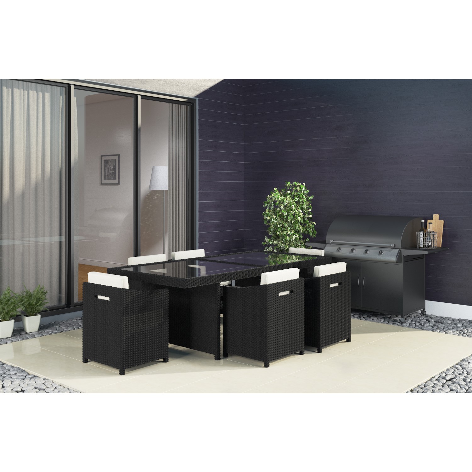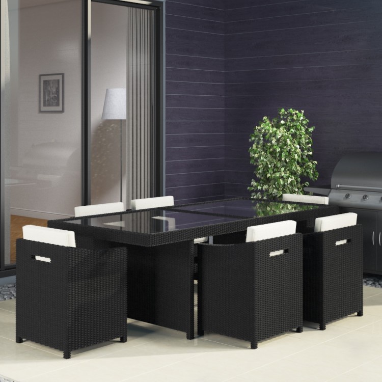 The Fortrose rattan 7 piece garden set is perfect for all manner of outdoor dining occasions. This stylish black set comes complete with a tempered glass top table and six chairs for all the family to dine outside and enjoy. The chairs are perfectly sized to fit neatly under the table to save space when not in use. All chairs come with removable cushions for added comfort.