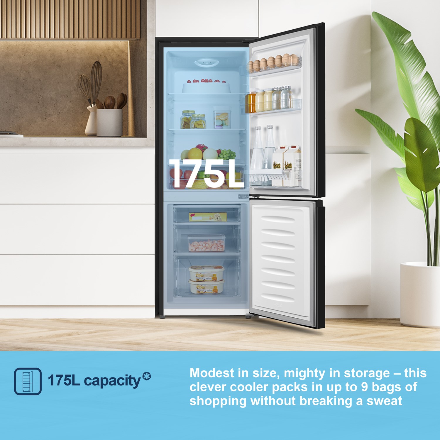 With a generous 175-litre total capacity, there’s plenty of room for your weekly shop, including frozen favourites and everyday essentials.