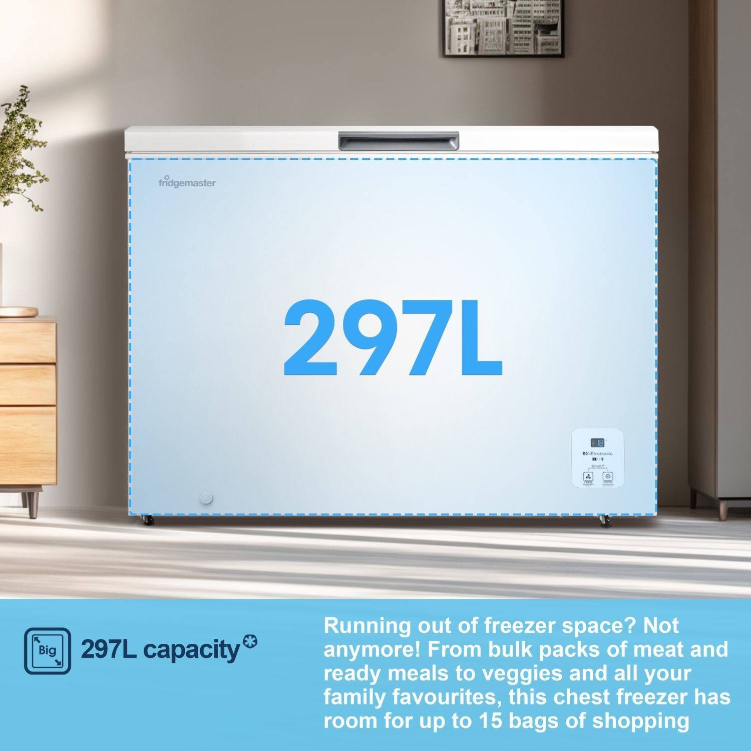 Looking for a chest freezer that’s as cool as you are? With this Fridgemaster 297L chest freezer, you’ve got all the space you need for ice-cream, frozen meals, and up to 15 bags of shopping. Whether it’s -15°C outside or a heatwave, the Winter Guard tech keeps everything in tip-top shape, so your food stays frosty and fresh. The electronic temperature control lets you dial in the perfect chill at the touch of a button. With flexible wire baskets and a superhero door seal, it’s the freezer that keeps things organised, fresh, and squeaky-clean. Plus, the recessed handle and adjustable feet make sure it's a breeze to place, access, and keep steady.