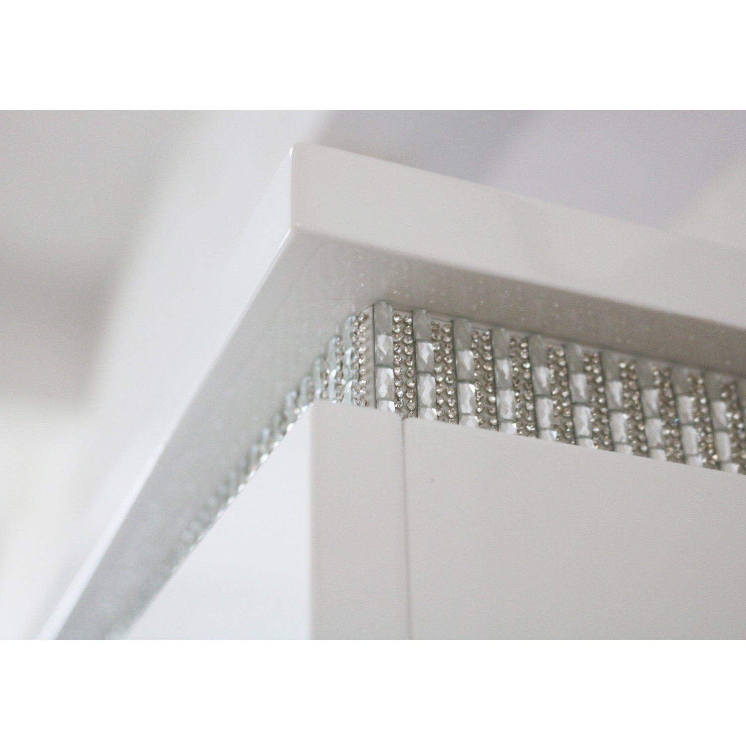 If you like a modern look and love a touch of glamour then the Gabriella range is just perfect for you. Sitting upon a stainless steel plinth this Gabriella wardrobe exudes contemporary elegance. The clean, linear design is finished superbly with a sleek white high gloss coating, giving a natural shine to the piece. The pureness of this wardrobe is sure to rejuvenate your space. Its crowning glory is a unique diamante trim, neatly positioned around the top, adding an elegant touch of sparkle to this otherwise clean cut piece of furniture.
