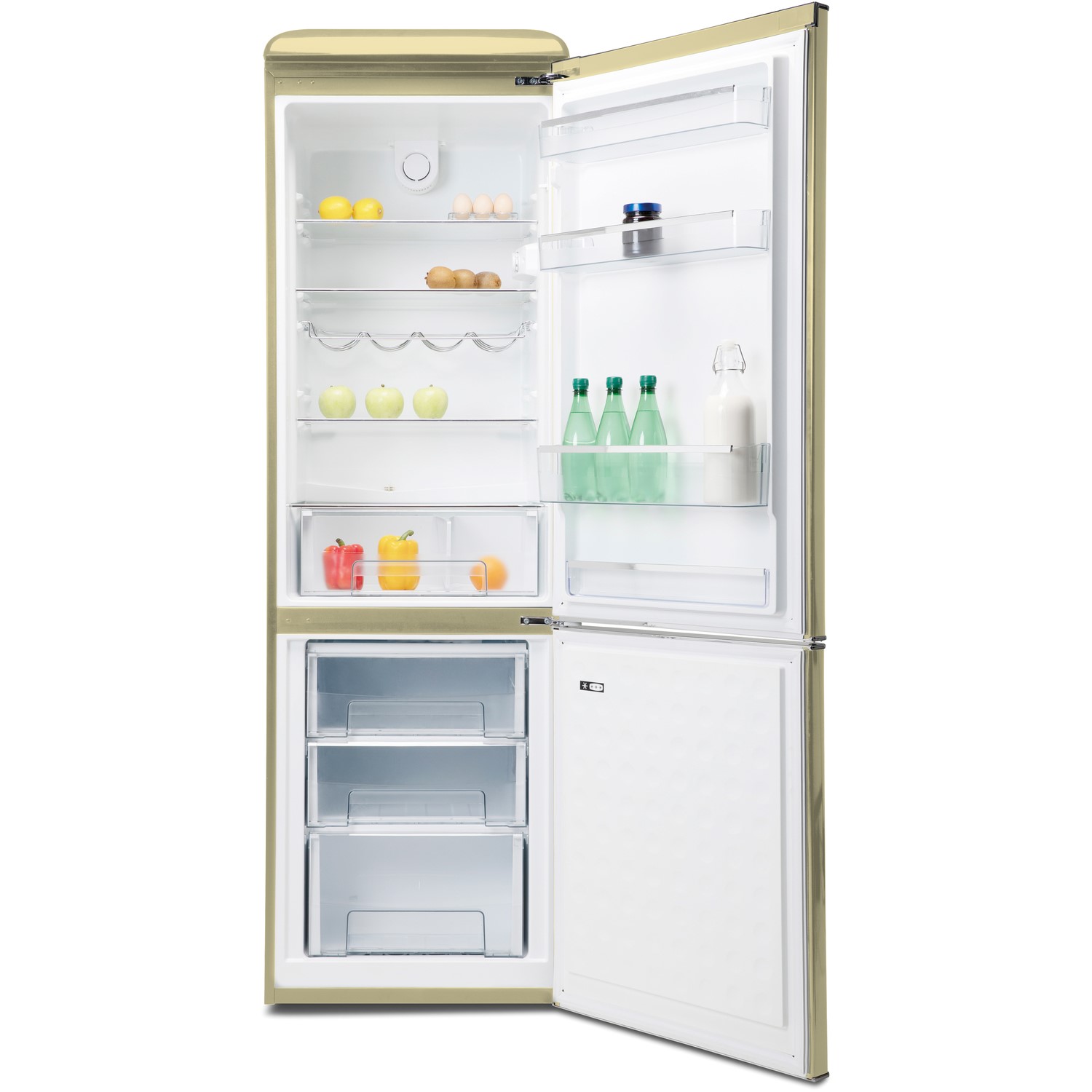 Galanz RFFK002C Freestanding Retro Fridge/freezer, 300 Litre (216L Fridge/84L Freezer, A+ Rating, Colour Cream, Fast Freeze, 3 Adjustable shelves, 1 Salad Drawer, 3 door compartments, LED interior light, egg tray and wine bottle rack, 4* Freezer rating, 3 freezer drawers, Metal Flame retardant rear panel, flat back design.