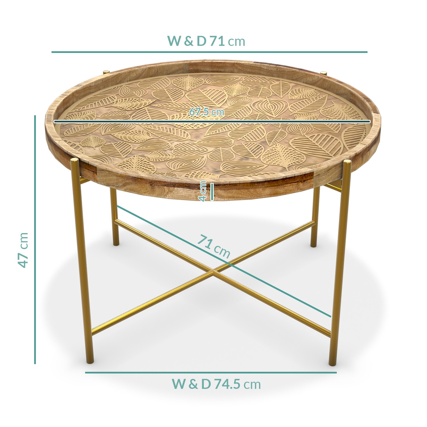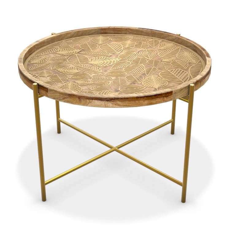 Make an elegant statement with this Elis coffee table. It's immediately striking thanks to the gorgeous gold leaf fretwork detailing which has been placed impeccably onto a solid natural wood tabletop. Resting upon a sleek gold coated foldable locking frame, it can be used at a moment's notice. It'll look fabulous taking centre stage in your living room.