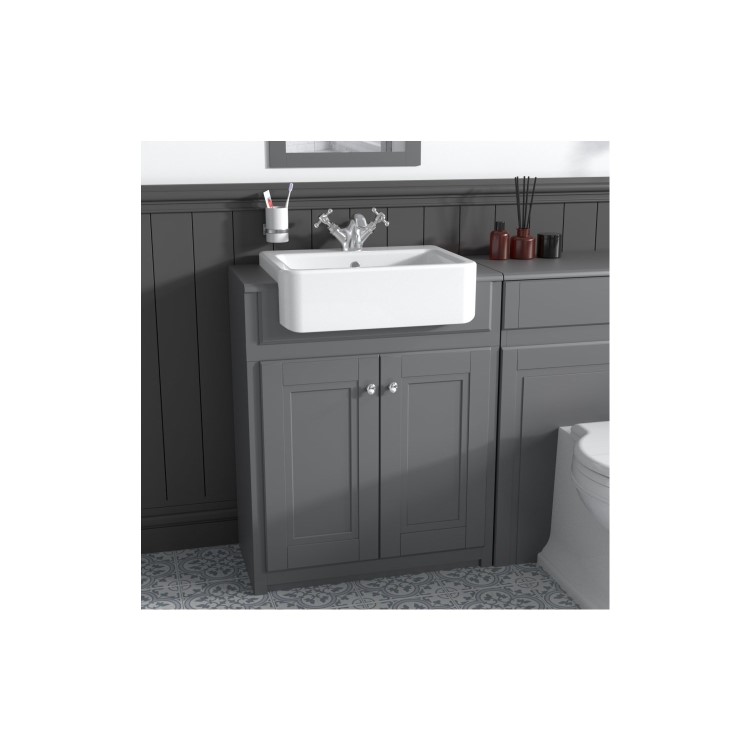 The Westbury traditional stone grey vanity unit with a glossy ceramic semi-recessed basin is the perfect transitional, traditional Vanity unit. Both the doors and front fascias feature a striking yet beautiful panelling design. The Westbury Range of delightful bathroom furniture hosts classic styling with practical storage solutions. The Vanity Unit features an internal shelf providing generous storage space for your toiletries, helping to keep your bathroom clutter-free. To maximise the amount of basin space for washing, the semi-recessed basin protrudes from the unit but is designed to look more purpose fitted.