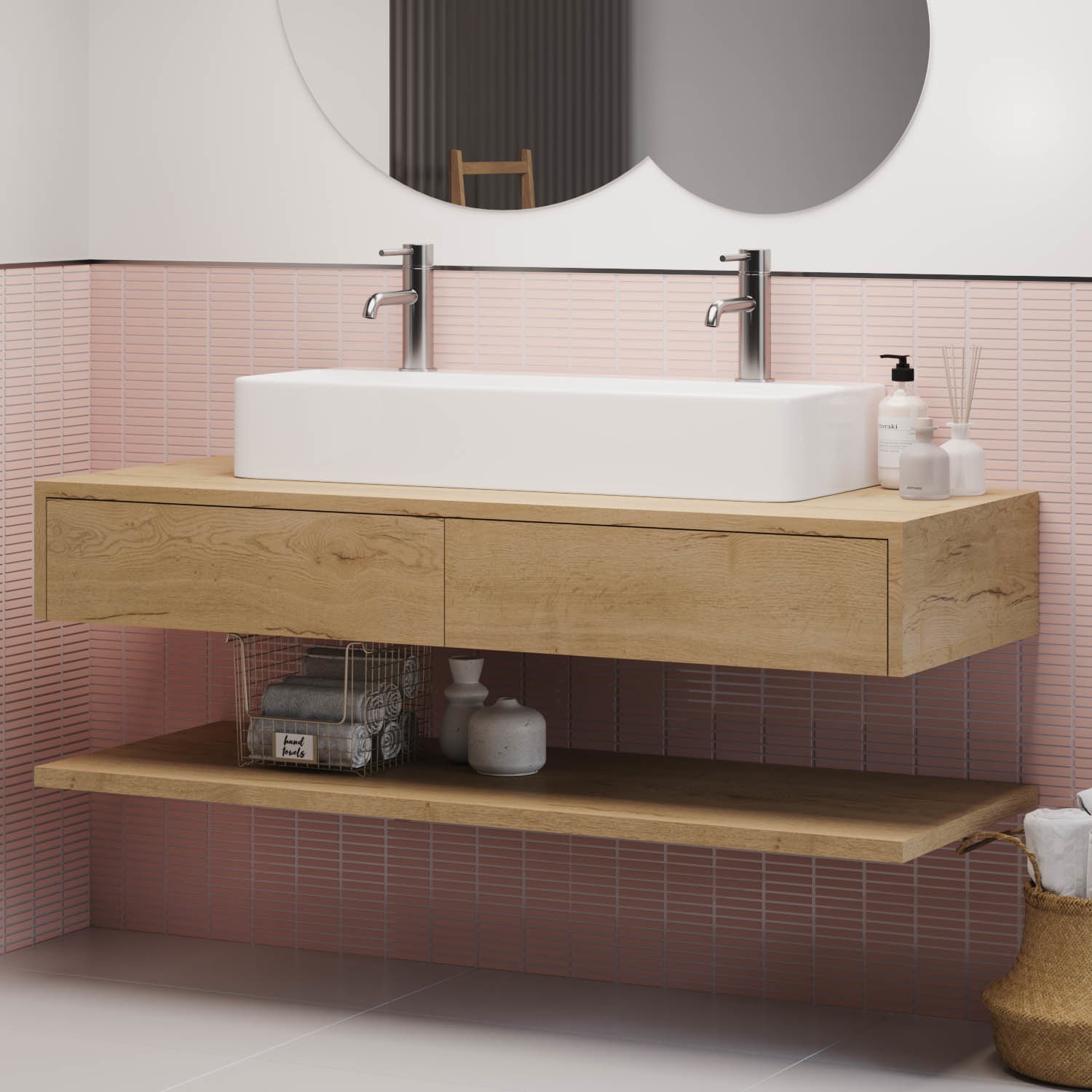 Enhance your bathroom with the spa-like Oak Lugo Double Vanity Drawer and Shelf. With a soft closing, push-to-open drawer and internal colourway, the Lugo exudes quality. Customise your own storage space with the stand-alone shelf and hanging brackets allowing you to adjust the height of your open storage depending on whether you want to add baskets, tall bottles or towels.