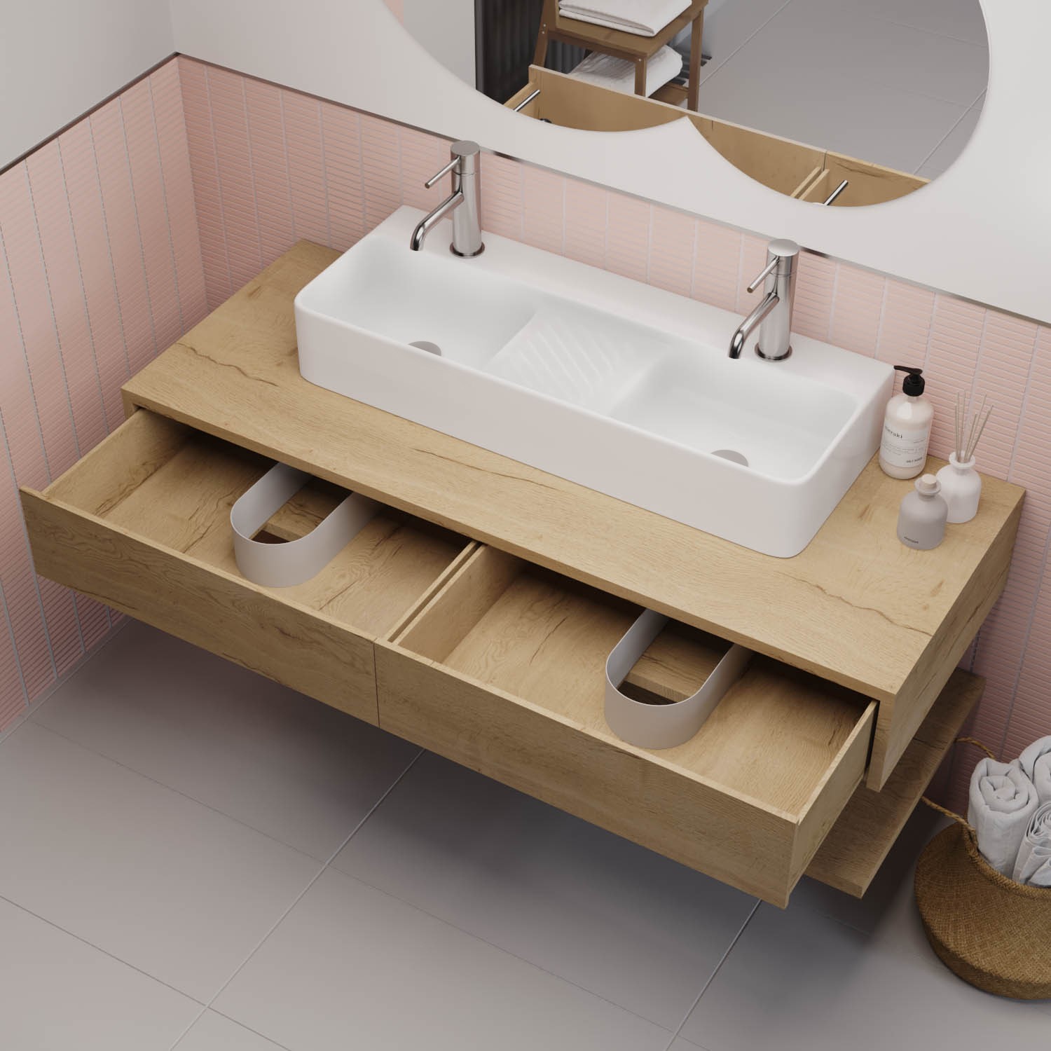 - Luxurious double vanity drawer unit and shelf perfect for a stylish bathroom