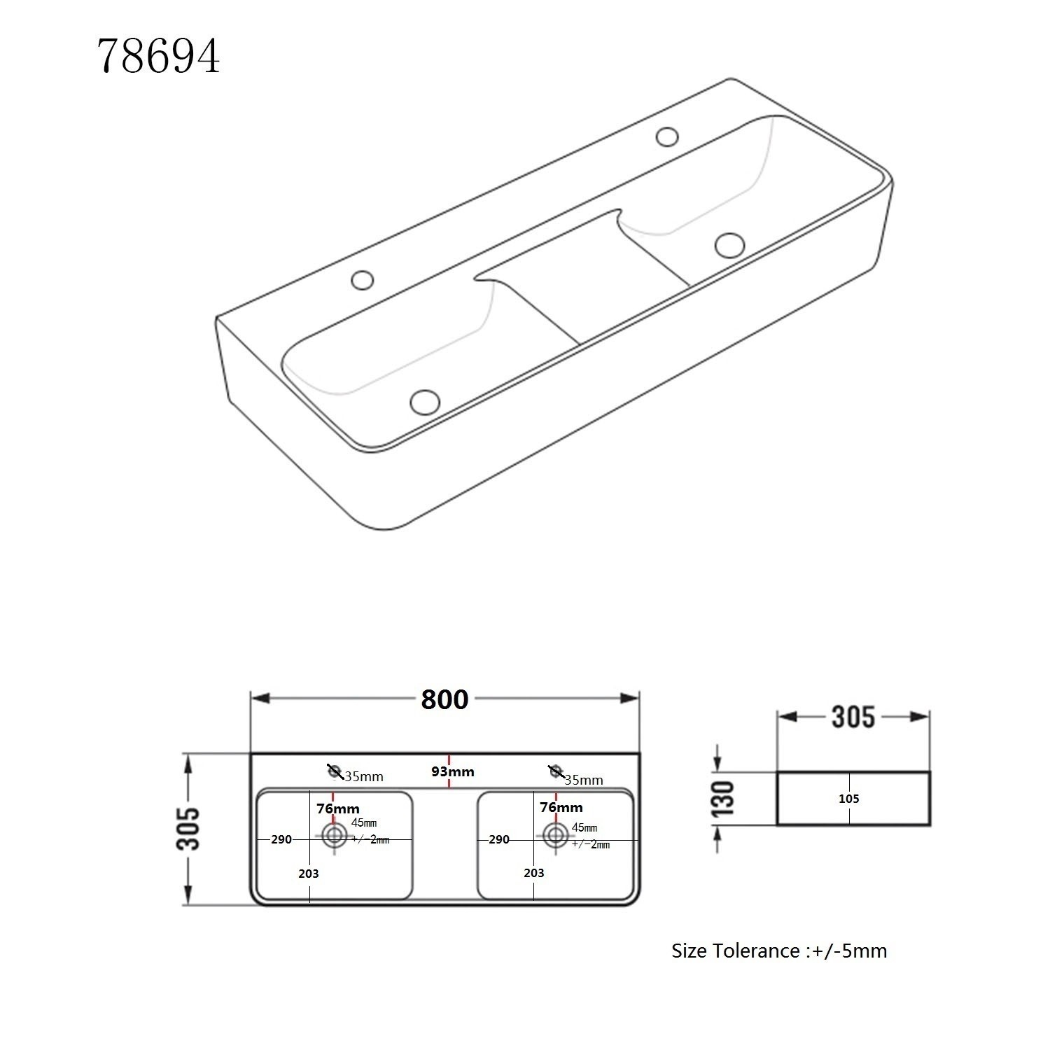 - Double basin max measurement: D340 x W340mm