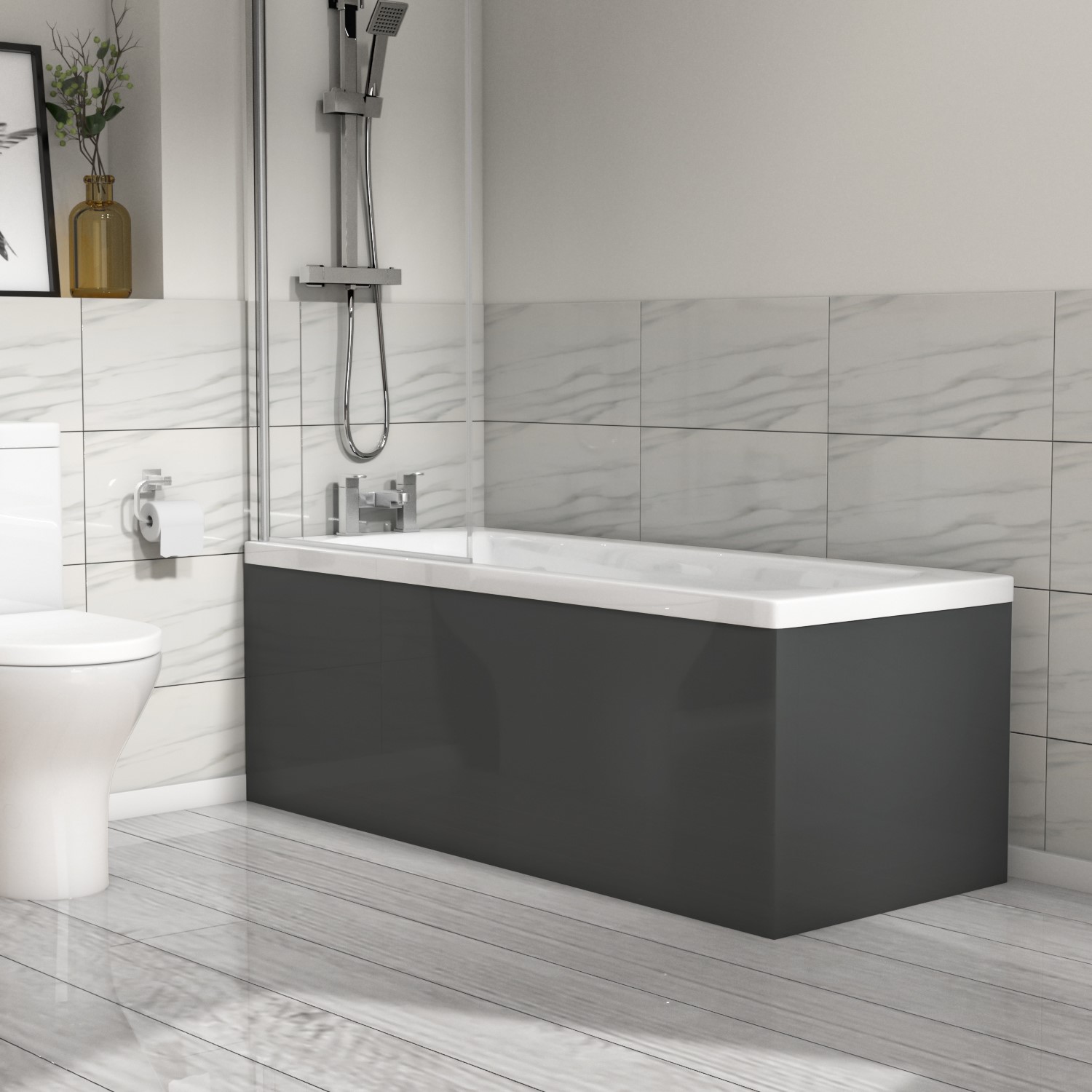 - Gloss finish bath panel with a modern panel design