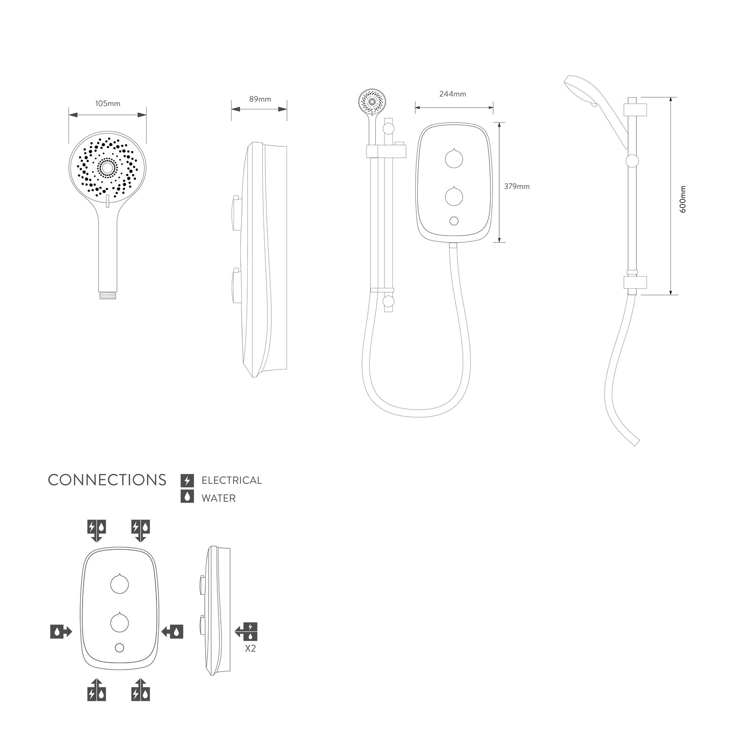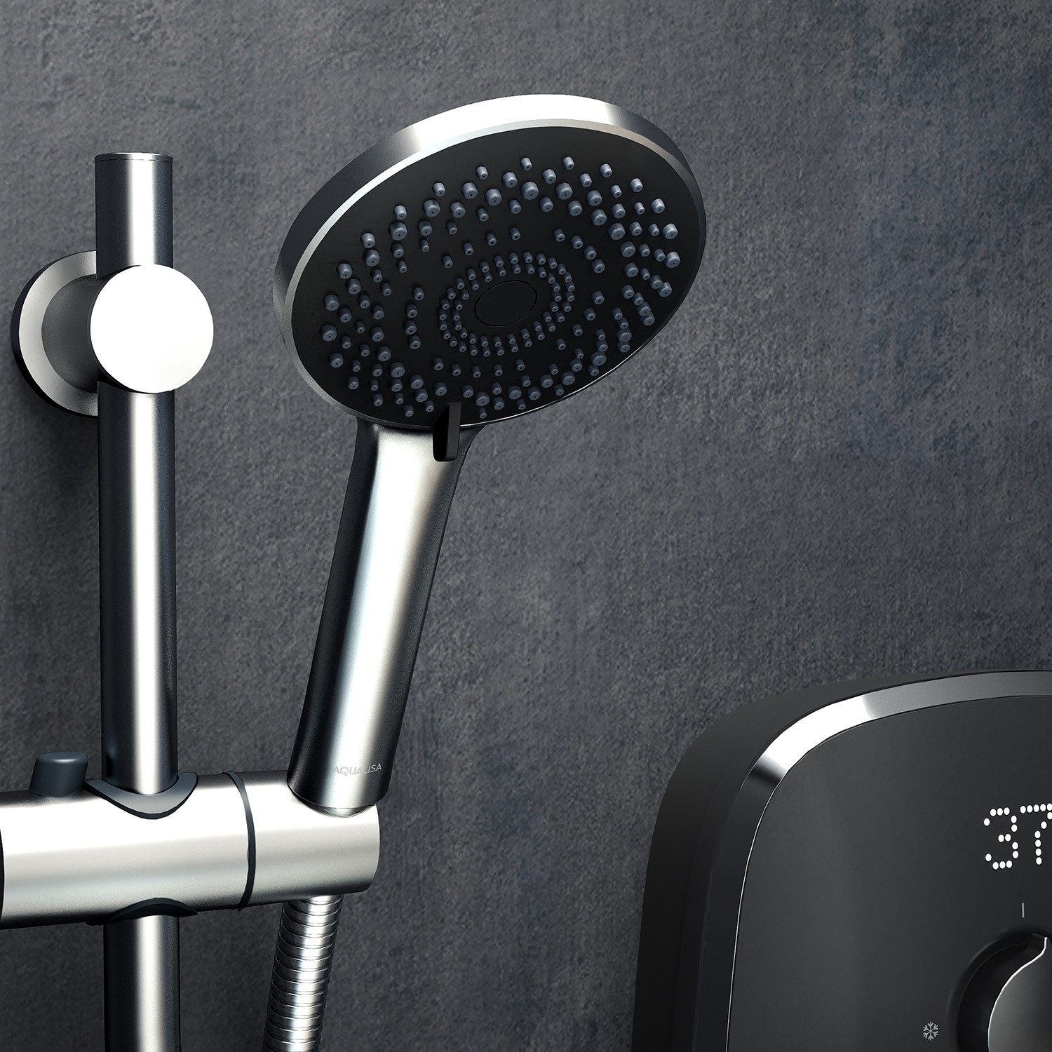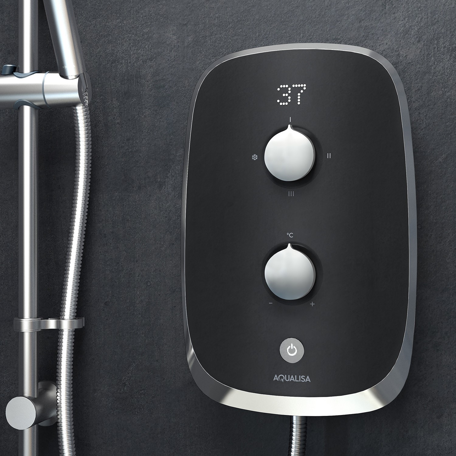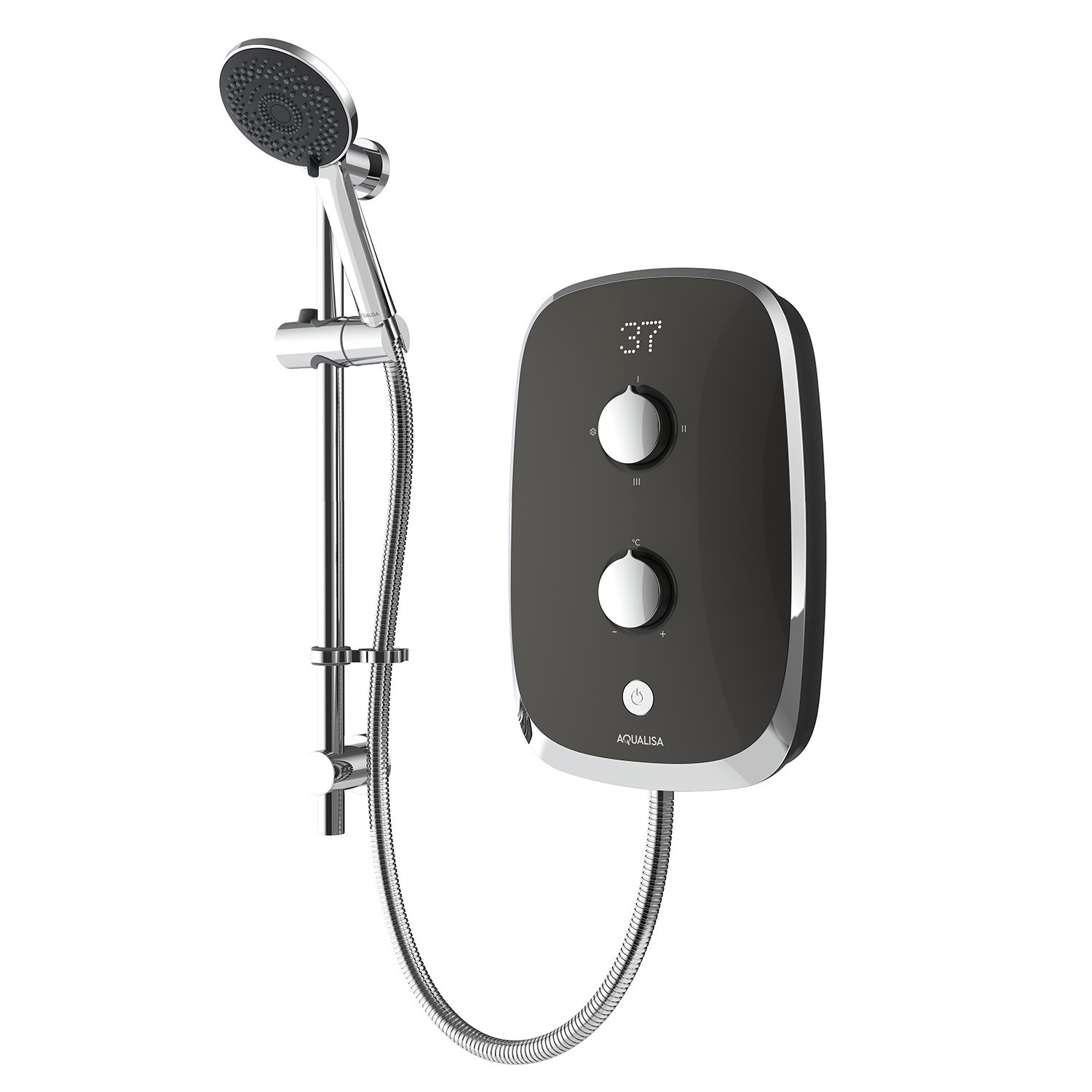 Upgrade your bathroom with Aqualisa's eMOTION electric shower in space grey. If you only have a cold water feed, this range of electric showers is perfect for replacing your old one and is retrofitable.Digital temperature display and control dial; Chrome trim; Illuminated push power button and Low water pressure indicator; Stainless steel hose; Universal multifit: 8 water & electric entry points; 105mm Splash Handset with 3 spray settings, rub clean nozzles and a push button slider; Over temperature protection and phased shut down safety features; Retrofitable