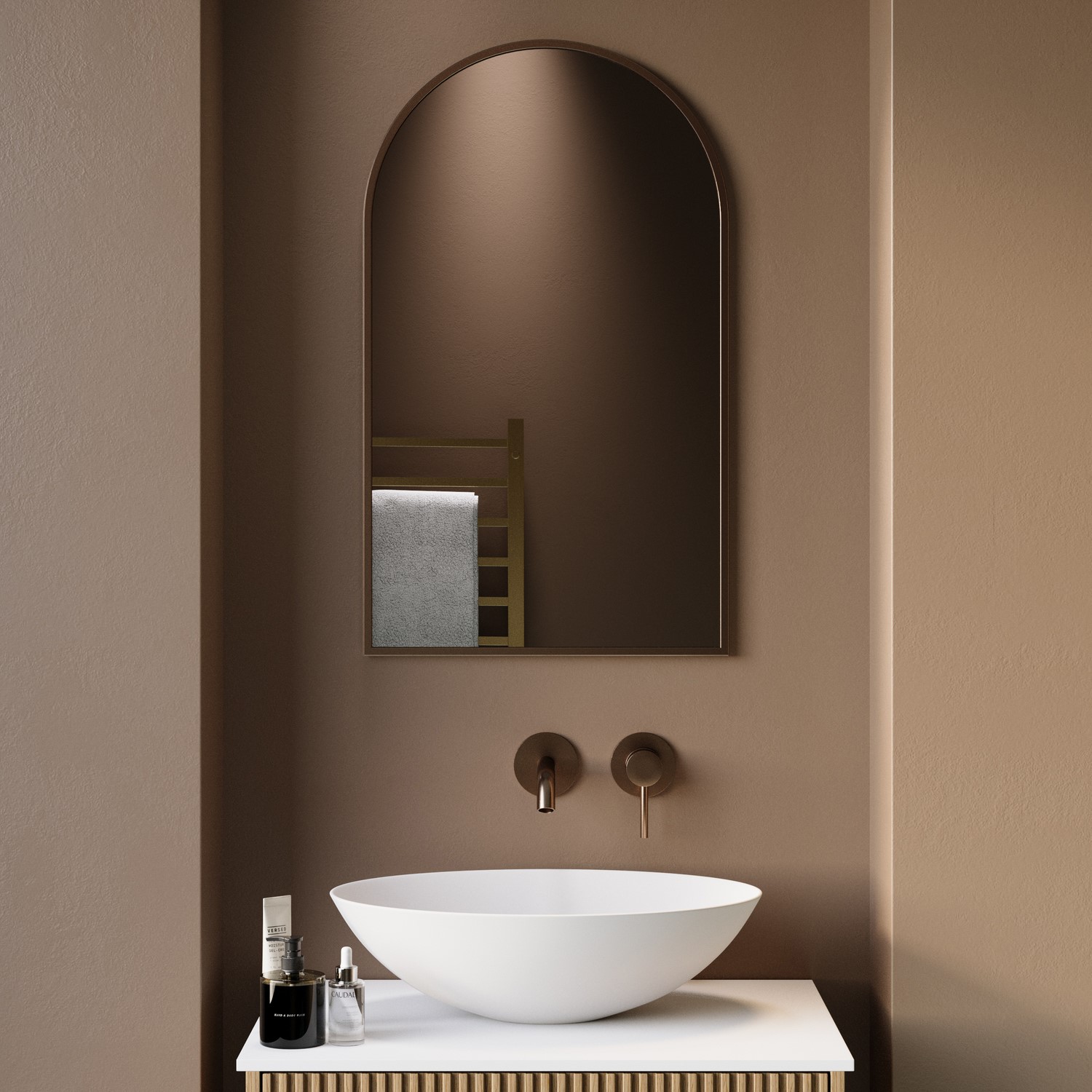Modern Statement: With its gently curved arched top and thin brushed bronze frame, this mirror makes a bold yet elegant statement in any contemporary bathroom.
