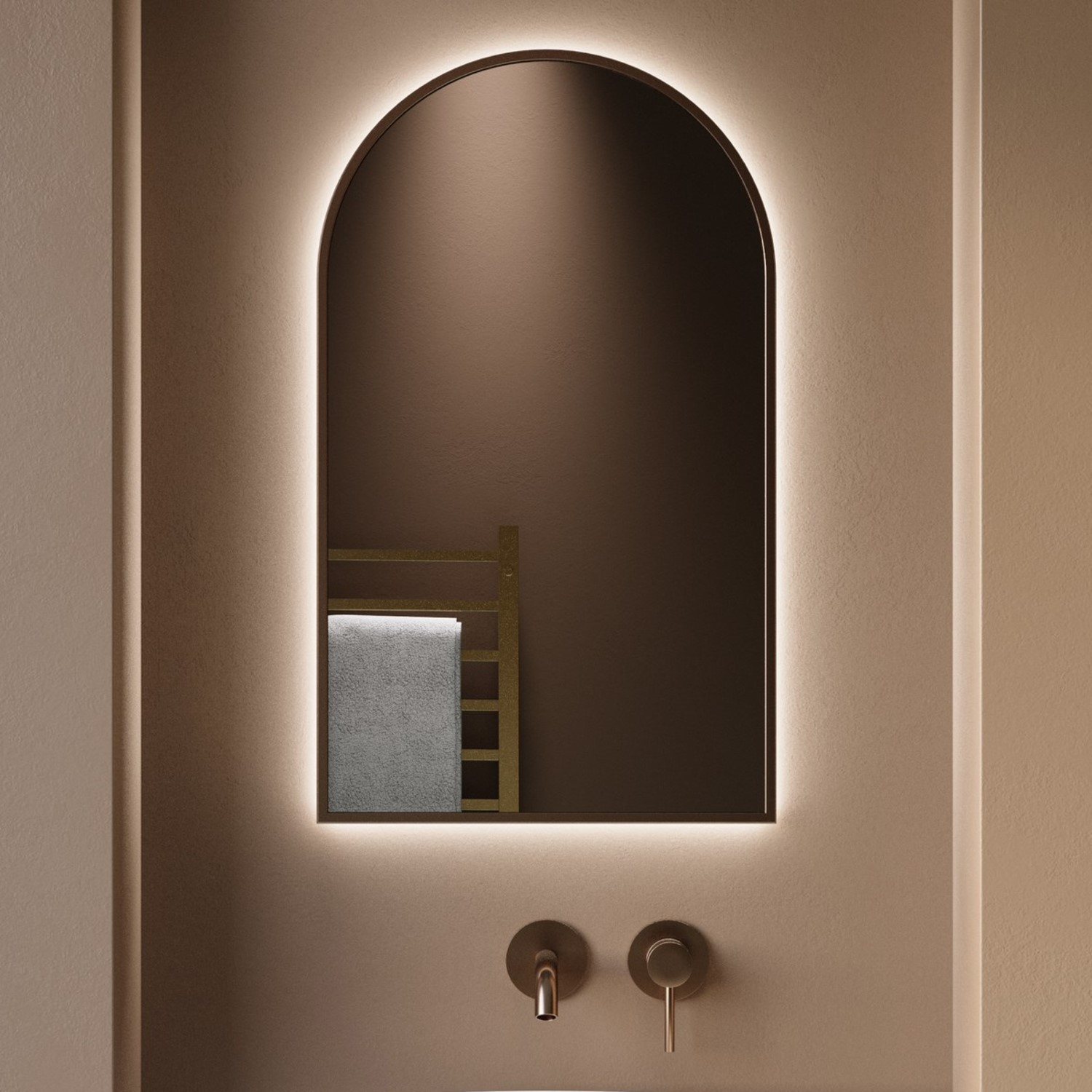 Upgrade your bathroom with this beautifully designed Empire arched backlit mirror with lights featuring a sleek brushed bronze frame. Measuring 500x800mm, this small mirror is a smart choice for modern cloakrooms and bathrooms. The sleek 10mm brushed bronze frame adds a modern, minimalist edge and provides a striking contrast that matches perfectly with other brushed bronze bathroom fixtures. The soft backlit glow frames your reflection perfectly while offering practical lighting for everyday routines. The adjustable colour temperature allows you to switch seamlessly between warm white (3000K), natural white (4000K), and cool white (6500K) to complement any mood or activity. Our innovative dimmable feature takes versatility even further, letting you set the perfect brightness for any occasion. Start your day with bright, clear illumination for precise grooming and makeup application, then lower the intensity in the evening to create a calming, tranquil atmosphere. The built-in memory function automatically saves your preferred brightness and colour temperature settings, so your mirror remembers exactly how you like it every time you switch it on – no need to readjust with each use.