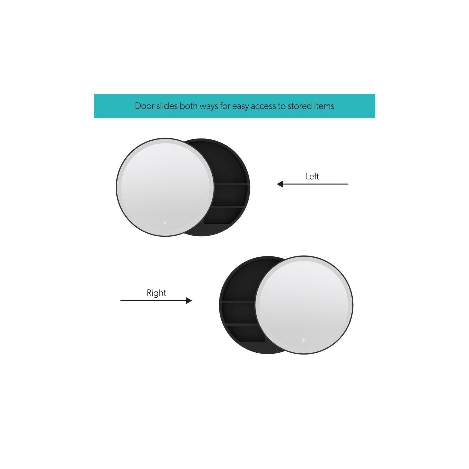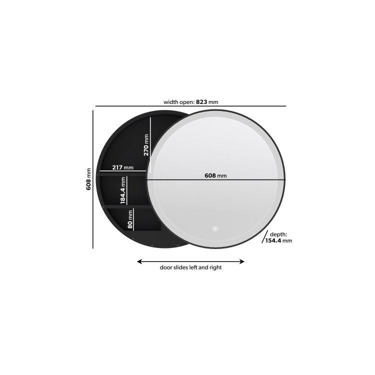 The Elara round bathroom mirror cabinet has an innovative sliding door. Move the cabinet door from left to right to access a wealth of storage space for your everyday essentials. Both sides of the cabinet reveal 3 shelves. Simply tap the touch sensor once to turn on the lights and the demister. Hold down the button to change the light from warm white to cool white.
