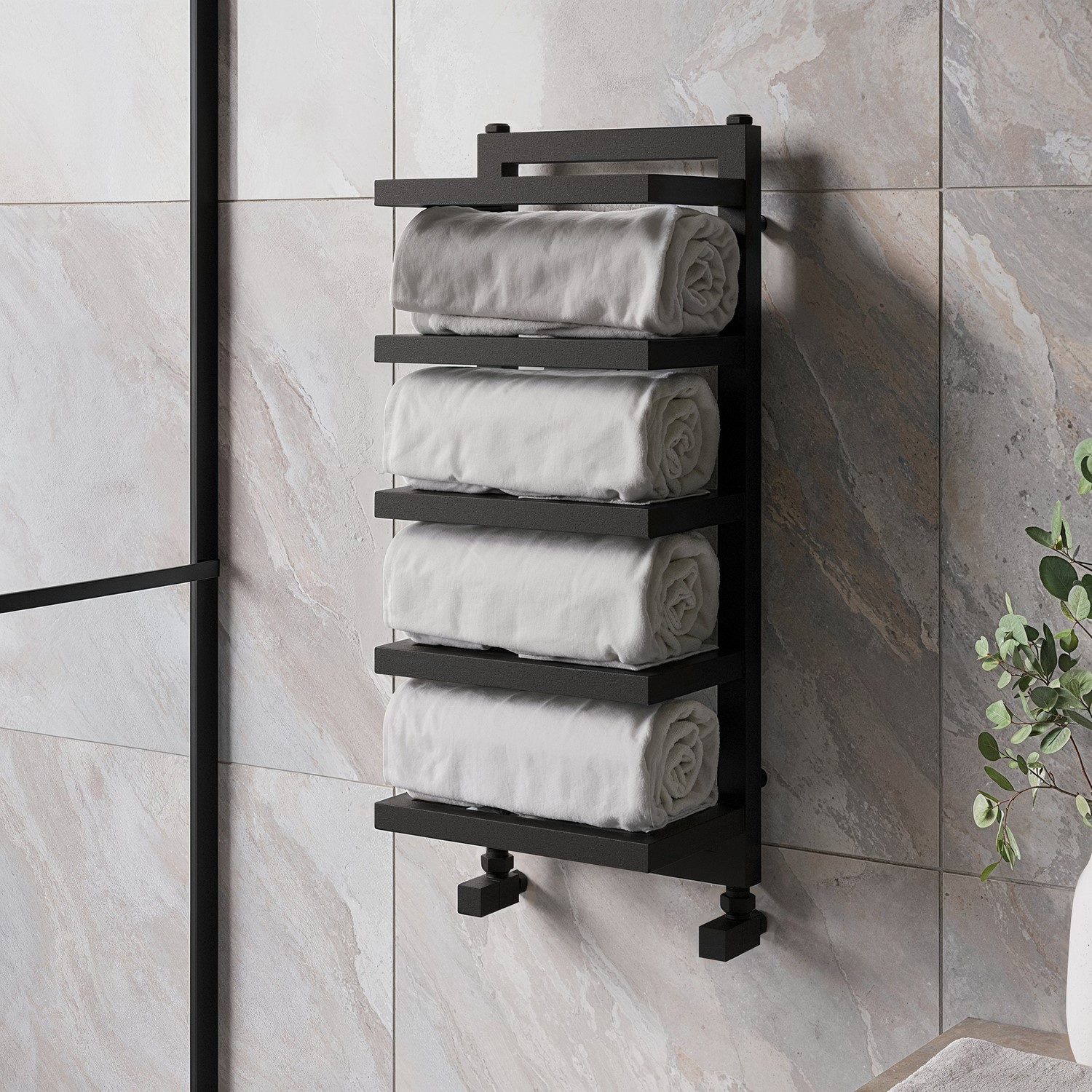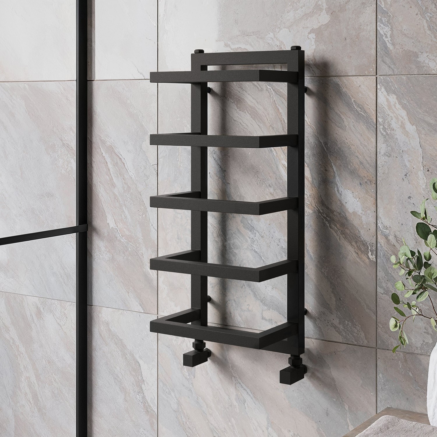 The Cairo heated towel shelf brings minimalist luxury to your bathroom. Its ultra-modern frame, finished in a distinctive black sand grain texture, offers both form and function. With five bars its ideal for stacking towels or hanging them to dry. Wall-mounted for a clean, clutter-free finish, Cairo is designed to make the most of vertical space, and is a practical choice that doesn’t compromise on style. Crafted from durable steel, this radiator is built to last. Its anti-rust and anti-corrosion properties make it ideal for humid bathroom environments, ensuring longevity. Steel’s excellent heat conduction means the radiator stays warm longer, maximizing efficiency.