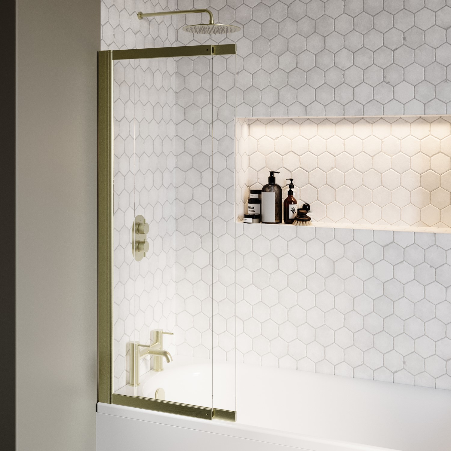 - Sliding and hinged bath screen in brushed brass adjusting from 44cm to 80cm