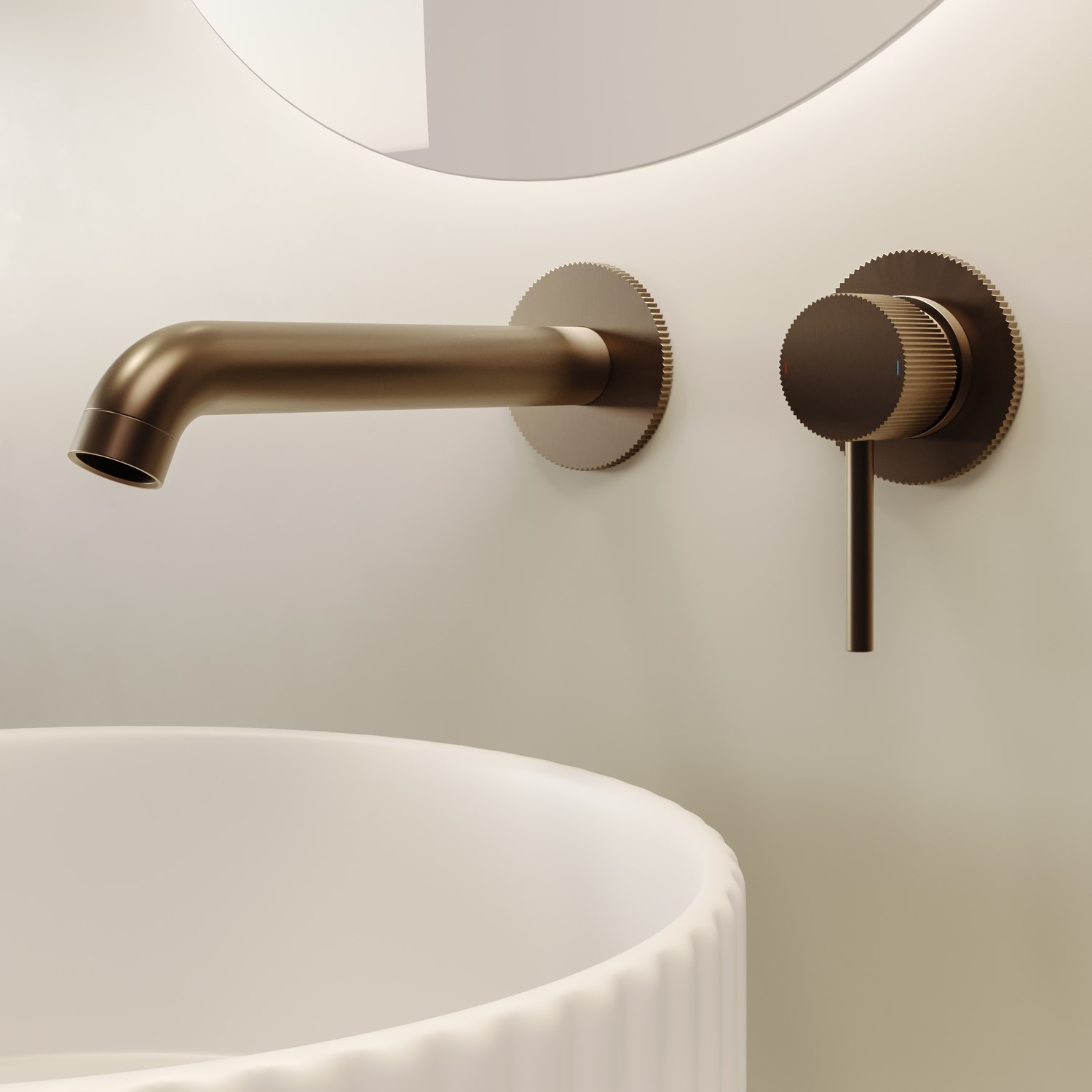 Bring spa-like serenity into your space with the Arissa fluted wall mounted bath mixer tap in brushed bronze. Its bold yet minimalist design adds instant style to any modern bathroom. The distinctive fluted handle offers a tactile grip and elevated visual aesthetic, while maintaining the minimalist Arissa silhouette in a brushed bronze finish. Manufactured from high-quality brass and coated with a durable PVD finish, it offers excellent resistance to rust and scratches, ensuring it maintains its modern appeal over time. The ceramic disc technology ensures a smooth, leak-free experience, while the brushed bronze PVD finish adds long-lasting sophistication.
